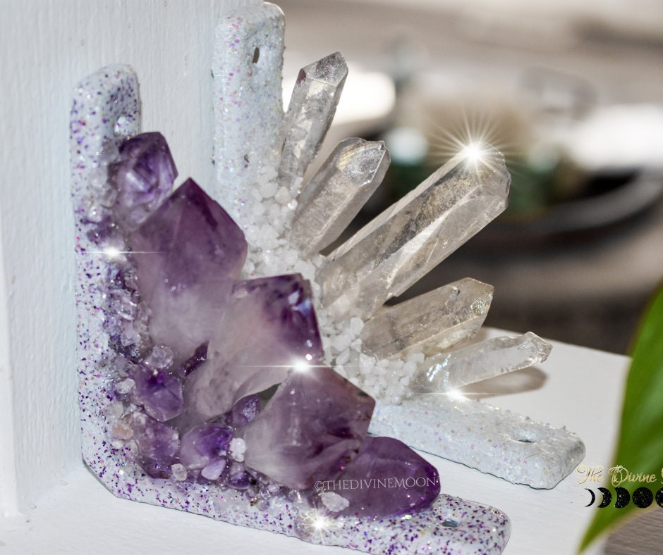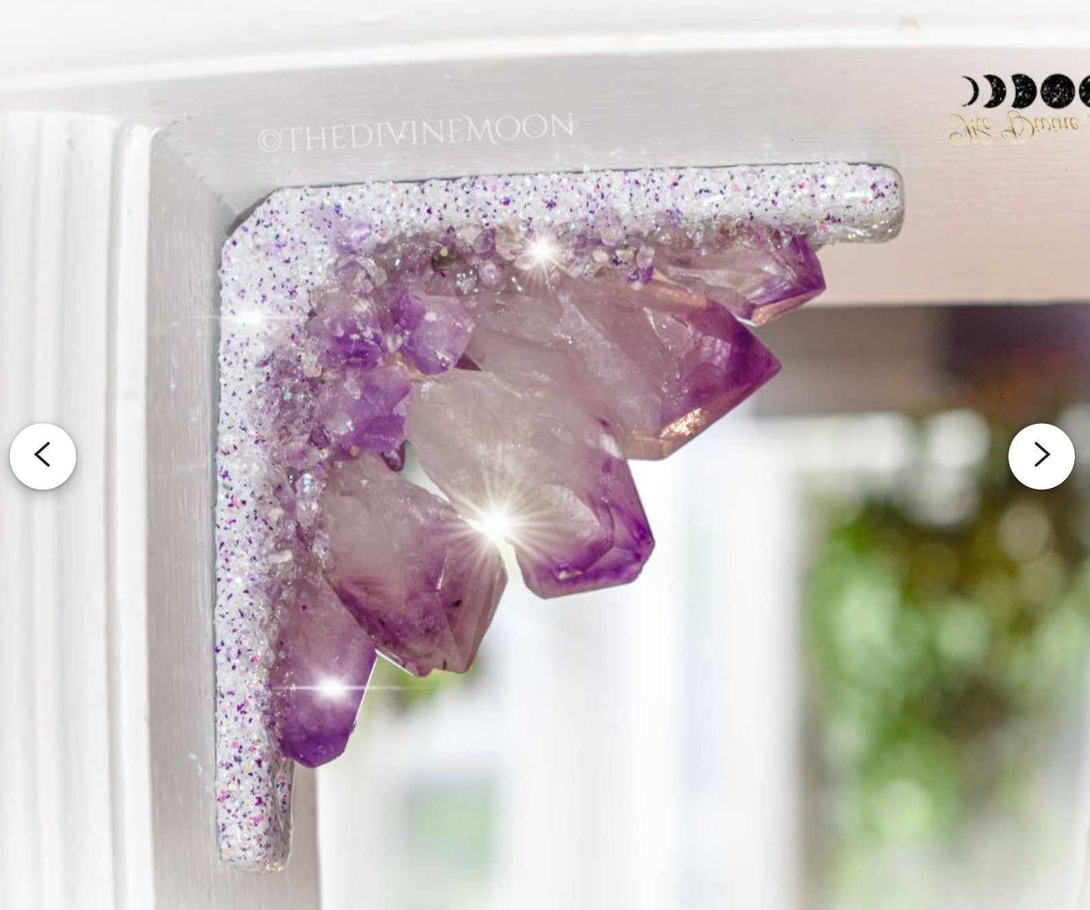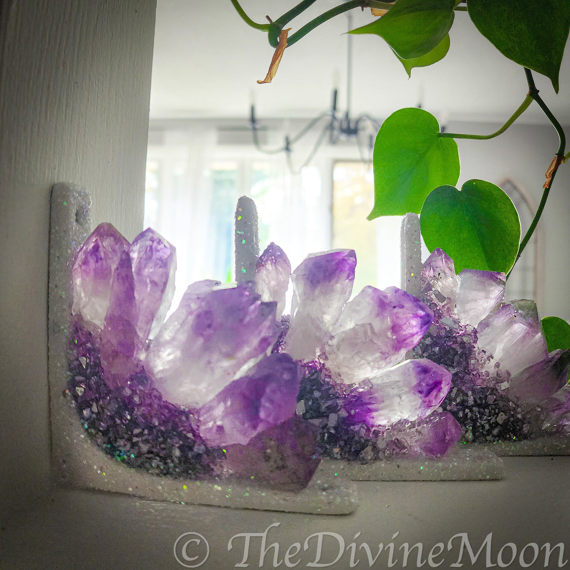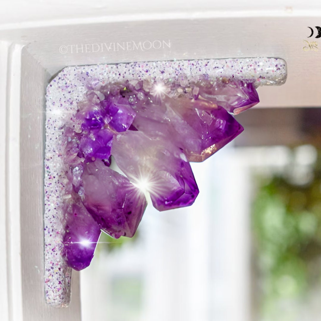 Designed to fit neatly into doorway or window frame corners, it features a cluster of natural amethyst points accented with shimmering highlights that catch the light beautifully. Details: Filled with genuine amethyst points and glitter accents