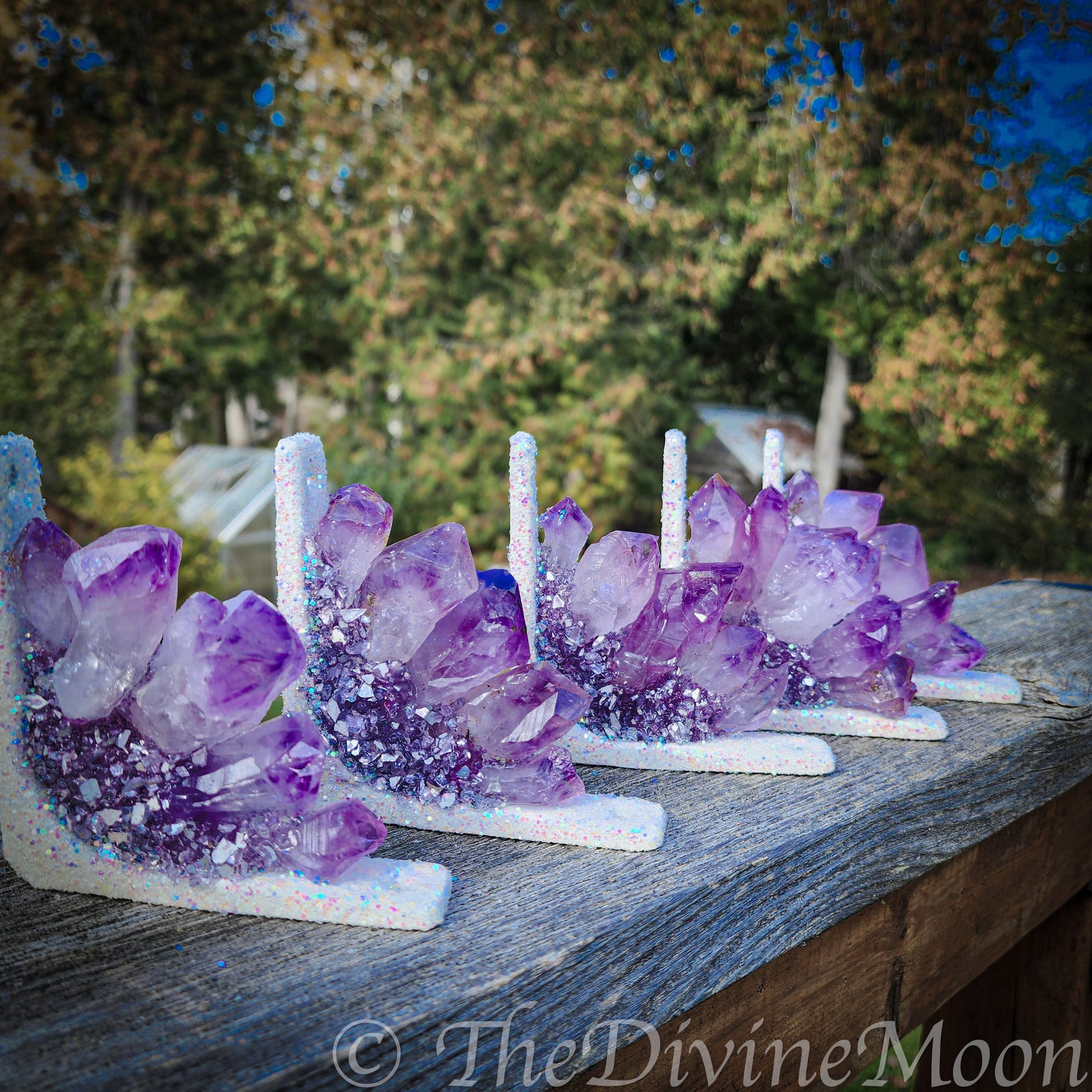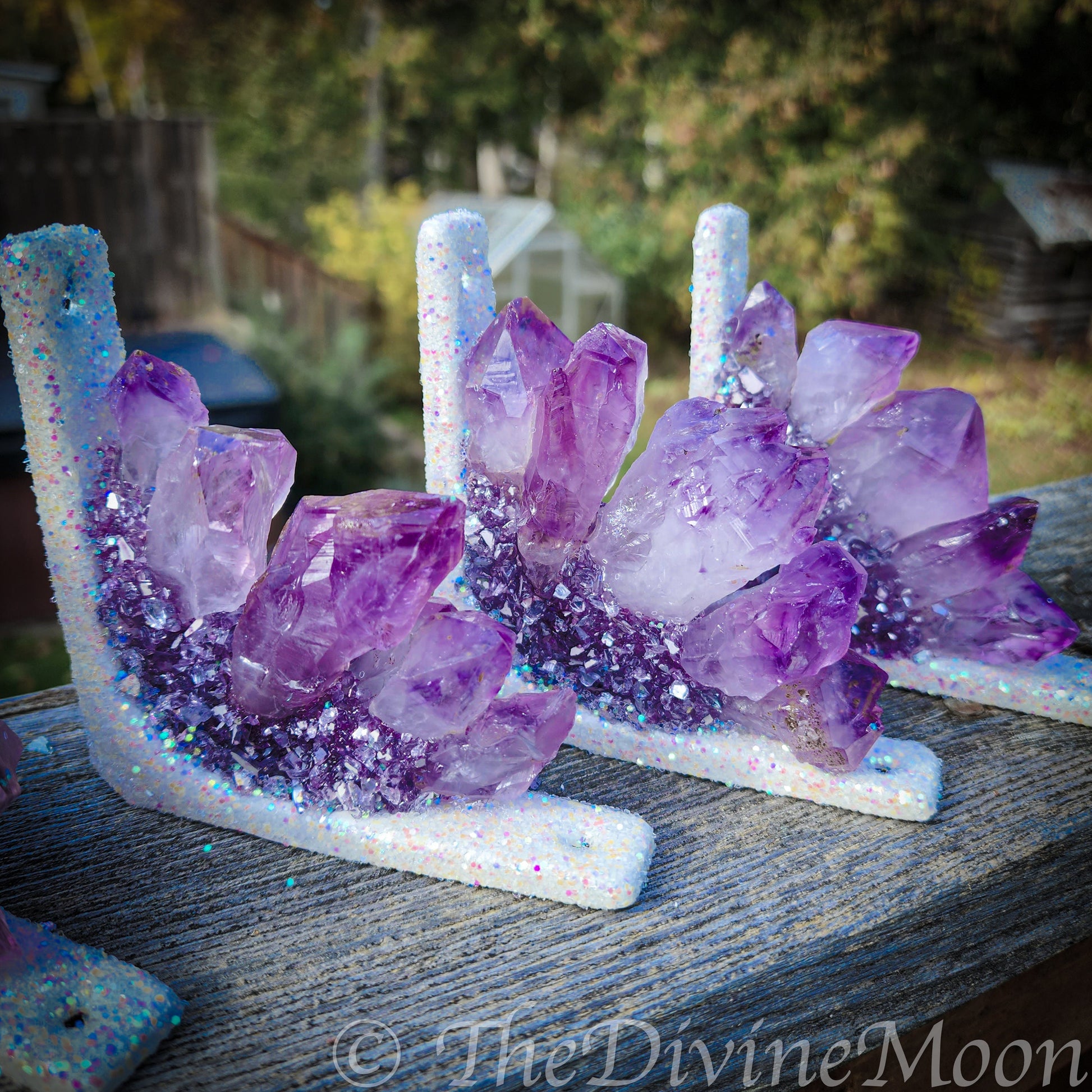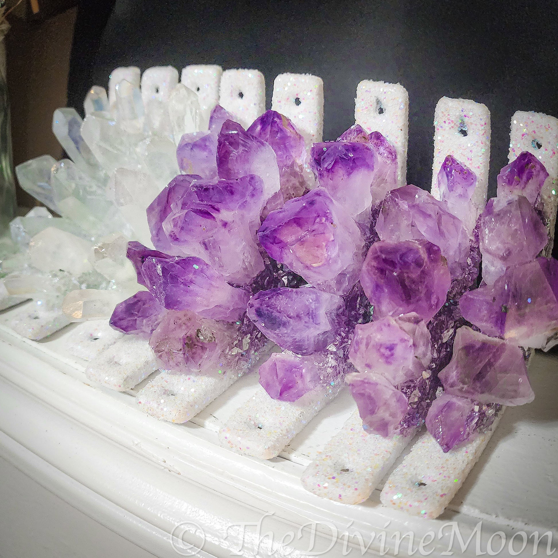 Designed to fit neatly into doorway or window frame corners, it features a cluster of natural amethyst points accented with shimmering highlights that catch the light beautifully. Details: Filled with genuine amethyst points and glitter accents