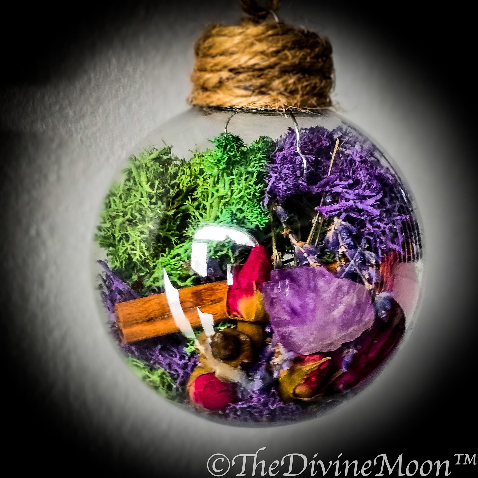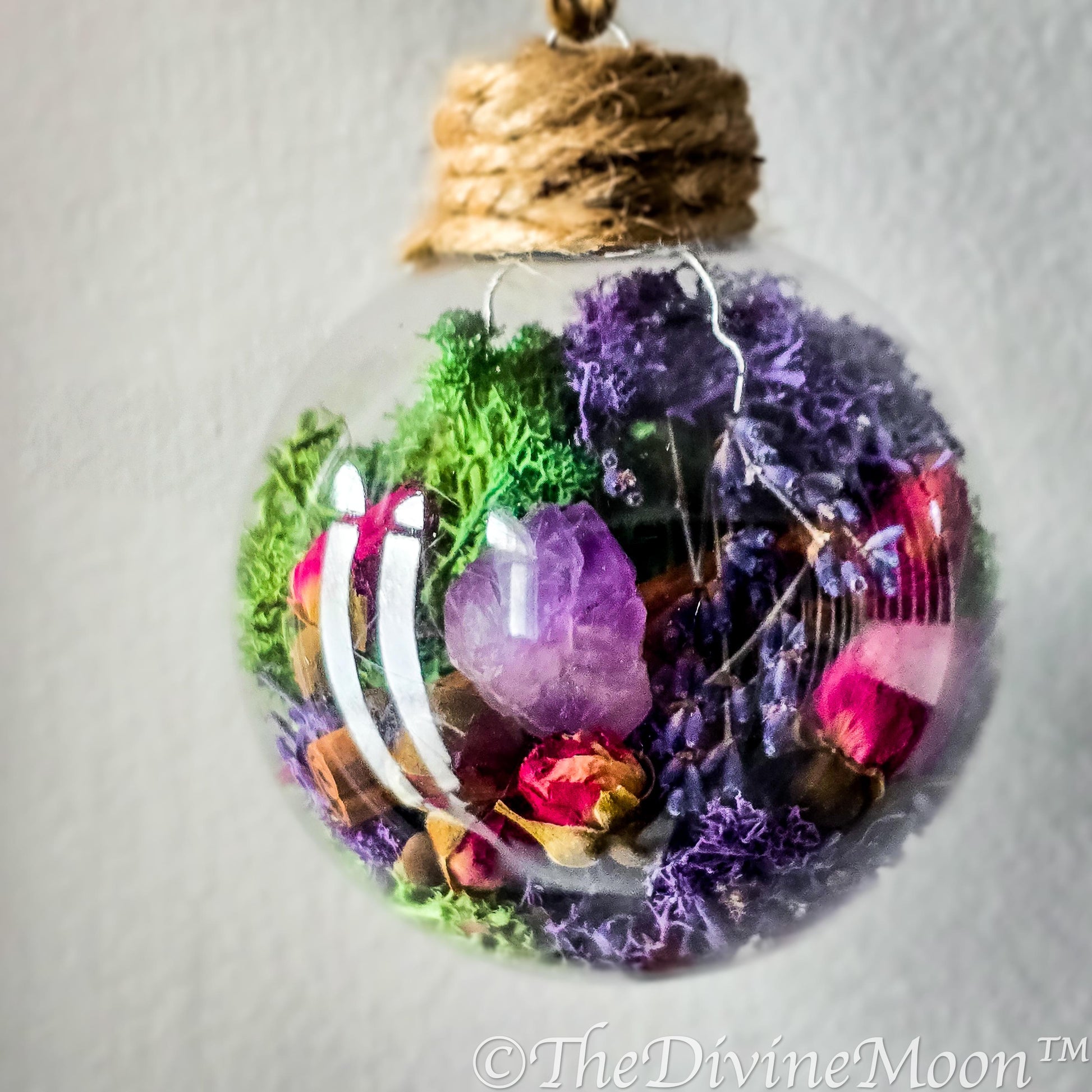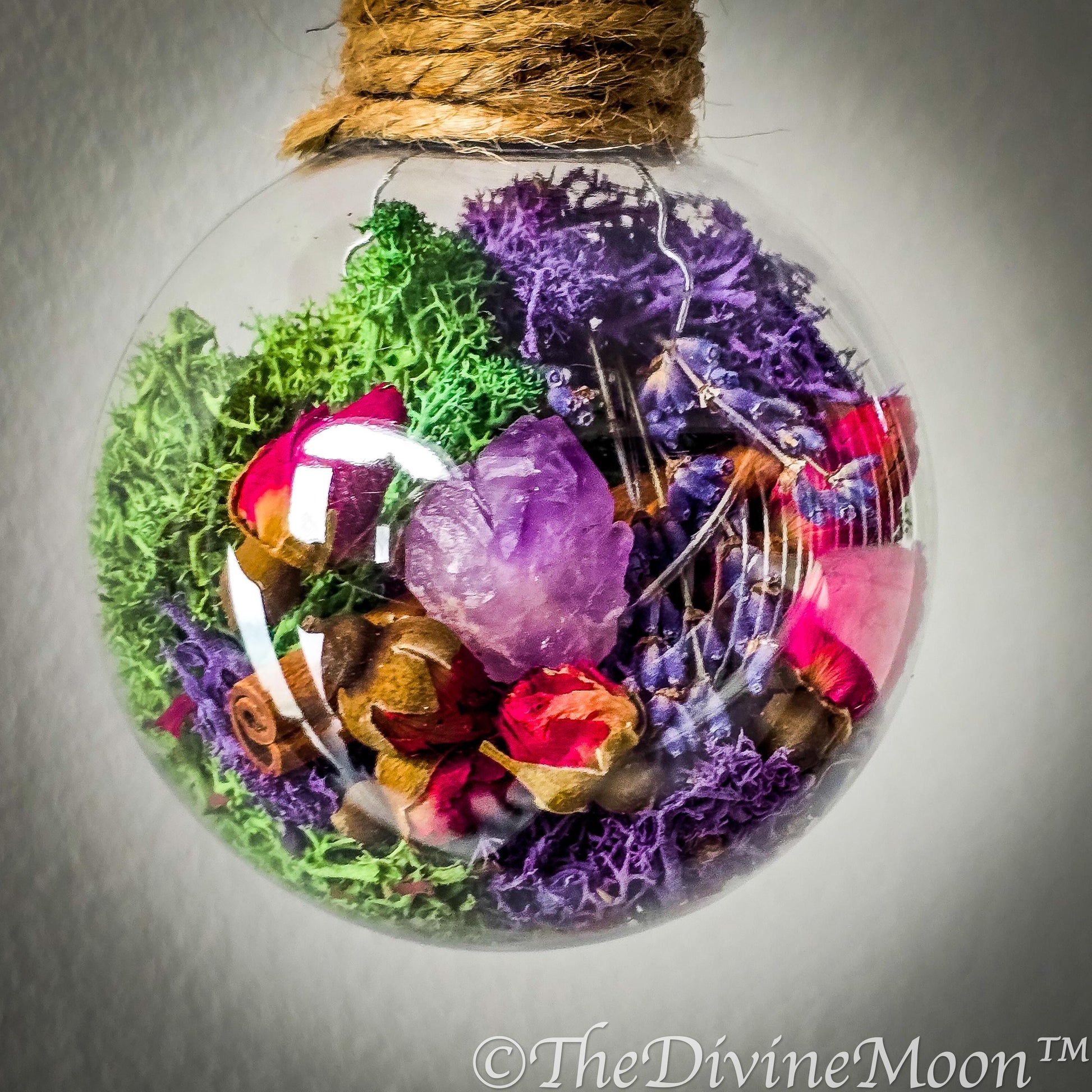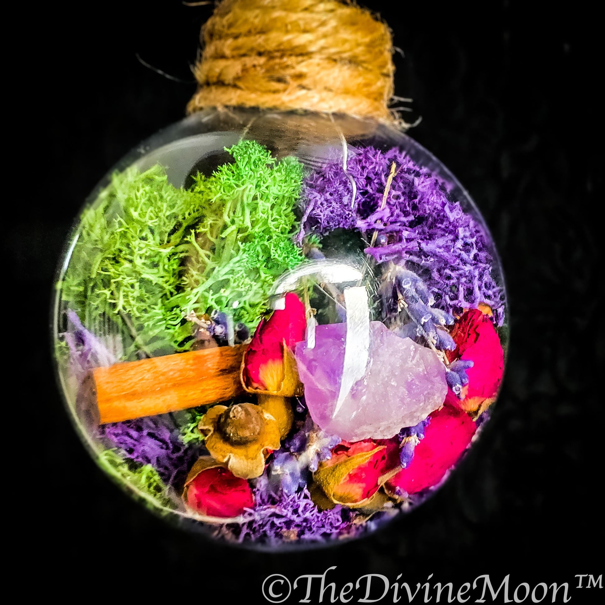🌙 Mystical Witch Ball – Handmade Decorative Crystal Ornament by The Divine Moon™ Add a touch of mystery and folklore to your space with this handcrafted Mystical Witch Ball — a symbolic home accent inspired by centuries-old tradition. Historically, vibrant glass spheres like these were displayed to attract the eye, reflect energy, and bring beauty and balance to their surroundings. Each ball is thoughtfully assembled by hand and includes a mix of natural botanicals and crystals, arranged in a way that brings visual intrigue and intention to any room. 🌿 Inside Your Witch Ball: Dried Rose Buds Sage Pink Himalayan Salt Obsidian Stones Green & Purple Moss Lavender Cinnamon Sticks Amethyst Crystal Charged under the full moon, each piece is created with care and attention to detail. The blend of materials reflects a symbolic harmony of nature, grounding, and serenity. Product Details: Approx. 3.1" diameter 5" hanging string for easy display Made from lightweight, durable acrylic plastic (not glass) Comes with tag and care information Handmade — variations may occur, making each piece one of a kind Where to Display: Traditionally, witch balls were placed near front doors or in east-facing windows. Today, they make beautiful additions to entryways, altars, or meditation spaces — offering a moment of calm and a connection to tradition. 🎁 Perfect as a gift for crystal lovers, spiritual seekers, or those who appreciate handcrafted home decor. Important