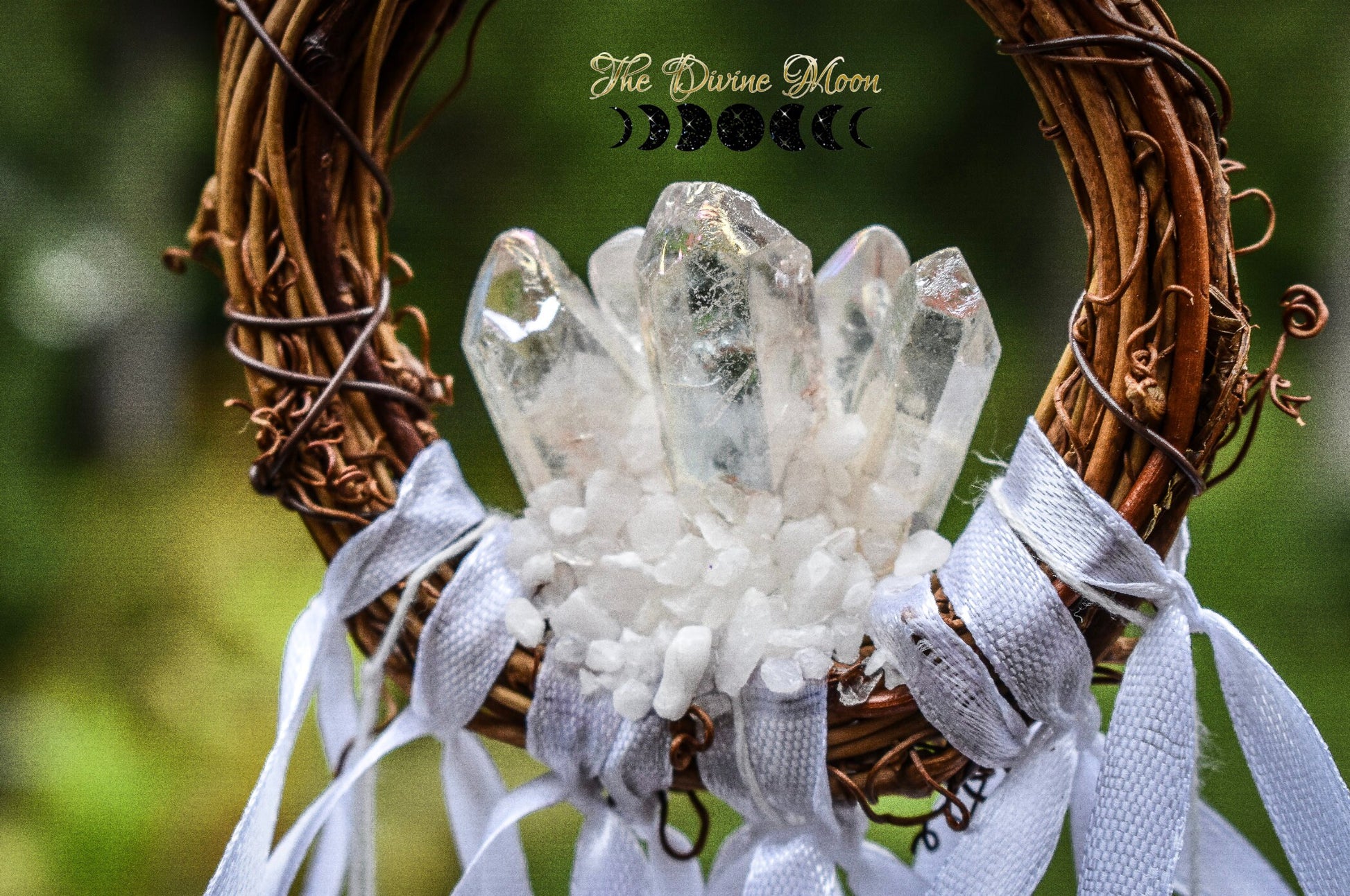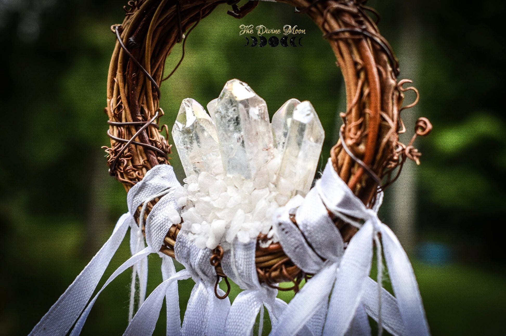 Add a touch of celestial charm to your home with this handcrafted witch bell display featuring five shimmering Angel Aura Quartz points. Made with care and attention to detail, this piece is perfect for hanging on doors, windows, or walls for a unique and meaningful accent.