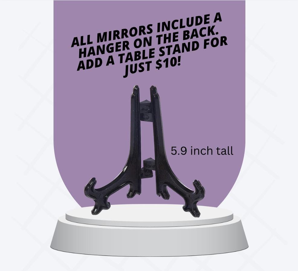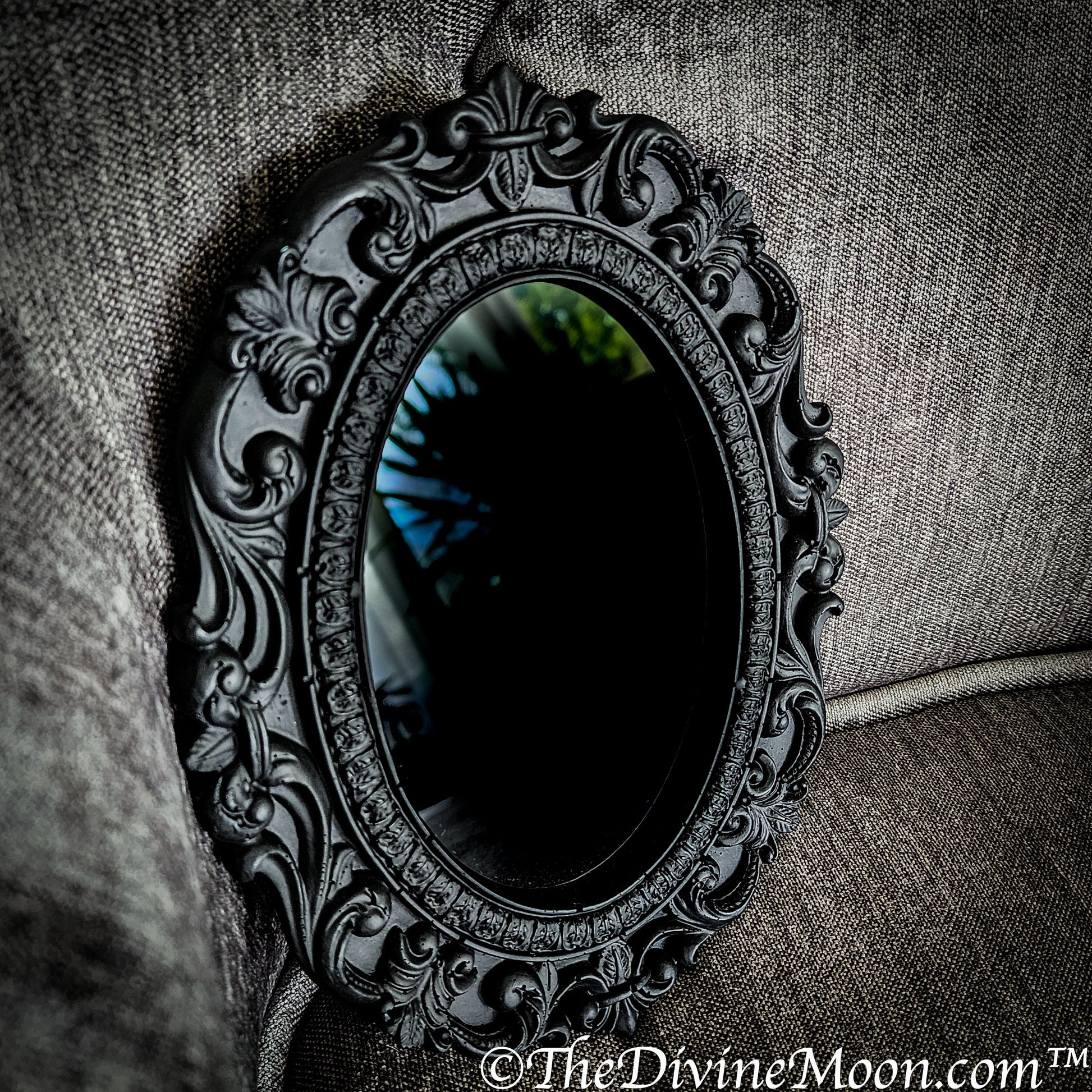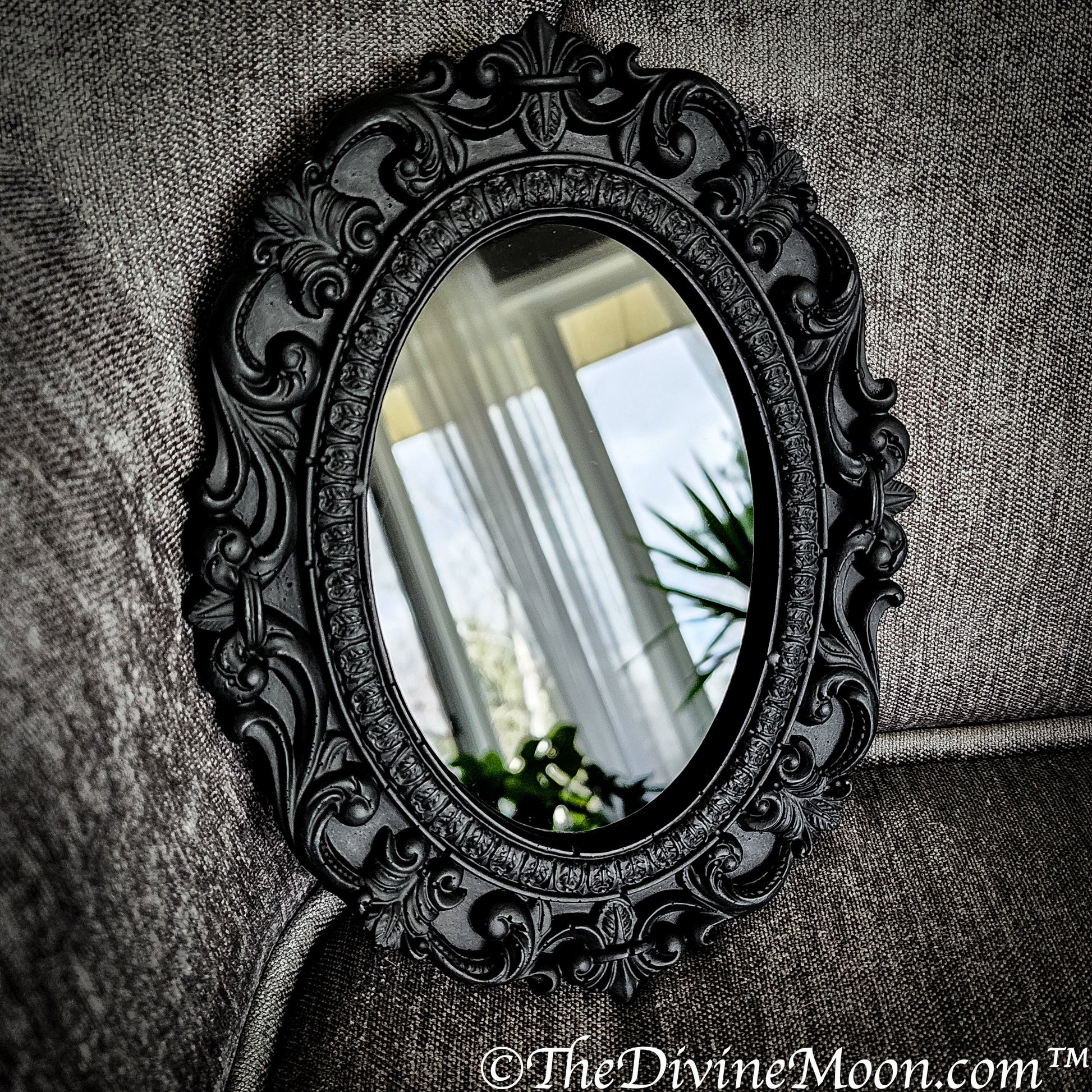 Medium Size 9 x 6.5 inches Black Ornate Gothic Round Hanging Mirror Victorian French 100% Handmade with acrylic glass mirror for scrying. Black Scrying Mirror with genuine handmade frame for witchcraft and wicca divination. Beautiful piece and one of a kind. Hangs on wall or stands leaning. A great altar wall piece. Includes "How to scry in a black mirror" letter.