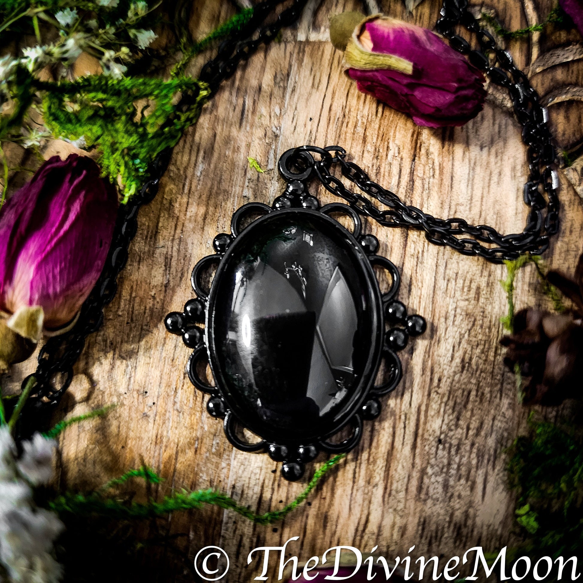 Necklace size 14 inch chain with pendant 1.5 inch. Authentic Scrying Necklaces handmade for on the go readings. Antique Black Ornate Gothic Round Black Mirror Victorian French Antique Black Vintage Scrying Black Mirror with genuine vintage necklace frame for witchcraft and wicca divination. Refinished necklaces with handmade insert for black scrying mirror. Beautiful piece and one of a kind. 4 styles. includes black chain. Includes "How to scry in a black mirror" letter.