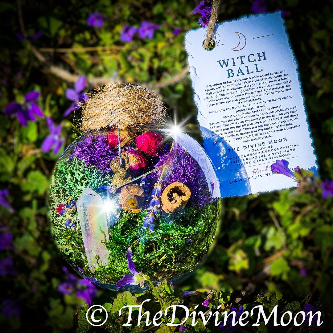 Charged under the full moon, every witch ball is handcrafted with intention and care. Product Details: Size: Approx. 3.1 inches in diameter Hanging String: 5+ inches long Material: Acrylic plastic (not glass) for safe handling and light-catching brilliance Includes tag and care note For indoor decorative use only The central Aura Quartz Point offers a striking focal piece, adding a luminescent energy to the natural layering of herbs, moss, and crystal. 💫 Inspired by centuries-old folklore: Traditionally, witch balls were hung to reflect light, attract attention, and offer symbolic protection. This modern version brings that tradition into a fresh, nature-focused design — perfect for spiritual décor, seasonal rituals, or thoughtful gifts. 🎁 A meaningful gift for crystal lovers, home energy seekers, or anyone drawn to mystical, handmade décor. Important