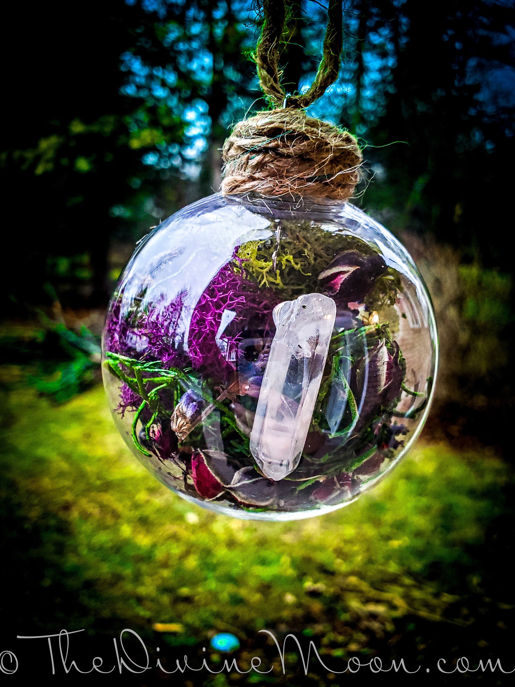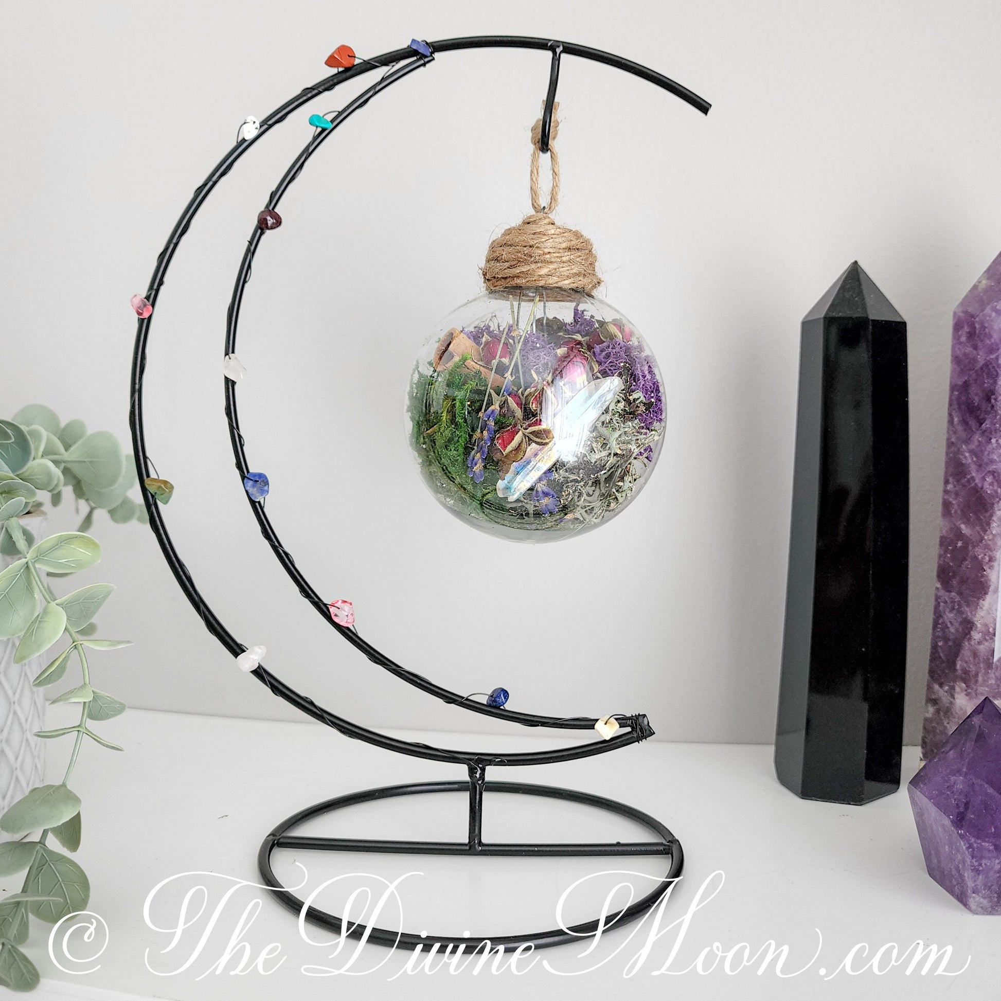 🌿 Handmade Witch Ball with Aura Quartz – Decorative Spiritual Ornament by The Divine Moonâ„¢ Add a touch of mystical charm to your space with this handcrafted witch ball — a decorative sphere rooted in traditional folk art and inspired by historical symbolism. Each ball is carefully assembled with natural materials and visually captivating elements, intended to create a peaceful and meaningful atmosphere in your home. Hang it near a doorway or in a bright window, where light can reflect off its contents and add a calming visual to your environment. Includes: Dried Rose Buds Sage Pink Himalayan Salt Obsidian Stones Green & Purple Moss Lavender Cinnamon Sticks Aura Quartz Point (large) ✨ Product Details: Approx. 3.1" in diameter (larger than standard-sized options) Hanging string measures 5 inches or longer Made from durable acrylic plastic (not glass) for safety and longevity Each one is uniquely handcrafted Tag and care note included The natural elements used in this piece have been long associated with tradition, seasonal practices, and personal rituals. Each ball is assembled and handled with care under the light of the full moon to enhance its visual and symbolic presence. 🌼 Inspired by Folklore: Witch balls have historically been used as decorative objects believed to attract and diffuse unwanted energies through their bright appearance and layered contents. Today, they serve as beautiful symbolic pieces — a nod to the past and a stylish addition to your space.Â