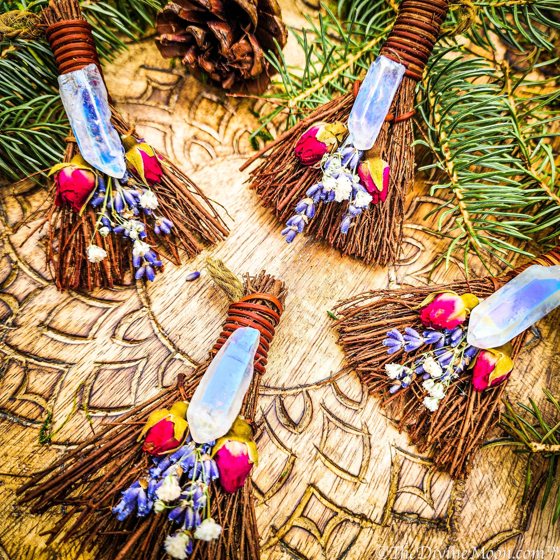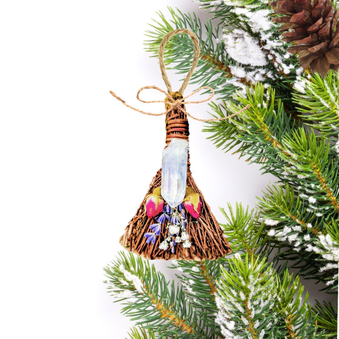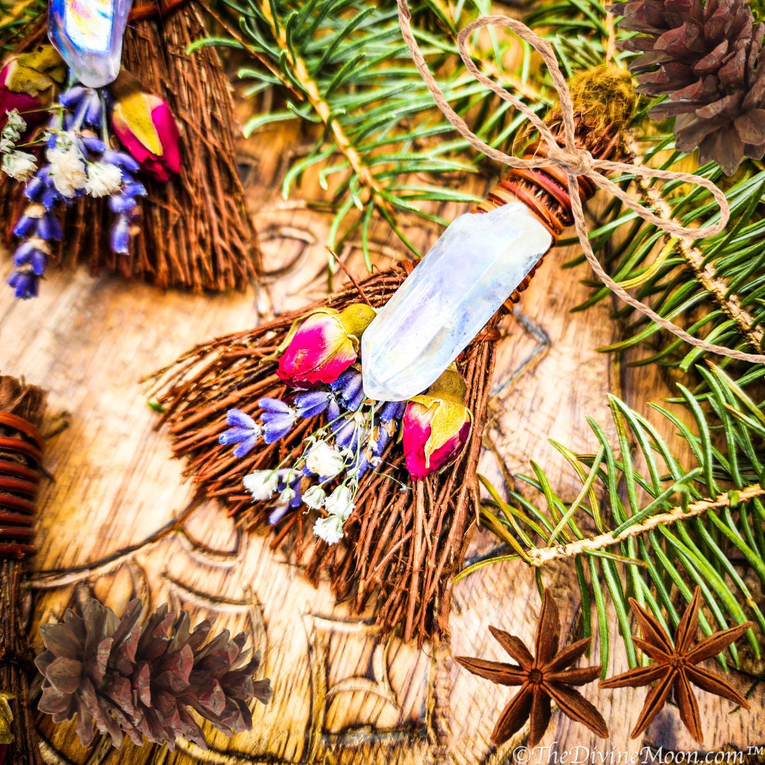 Authentic Mini Besom for ones altar, holiday ornament or display. 3 inches, Angel Aura Quartz Crystal plus dried florals. In old folk lore Known for- hanging a cinnamon broom on the back of your door or beside it, symbolizes the sweeping away of obstacles and/or the negative influences of those who enter your home or try to. It helps you multiply good energy and draw in luck and prosperity while warding away negativity. This can also be for holidays of yule or Christmas ornaments.