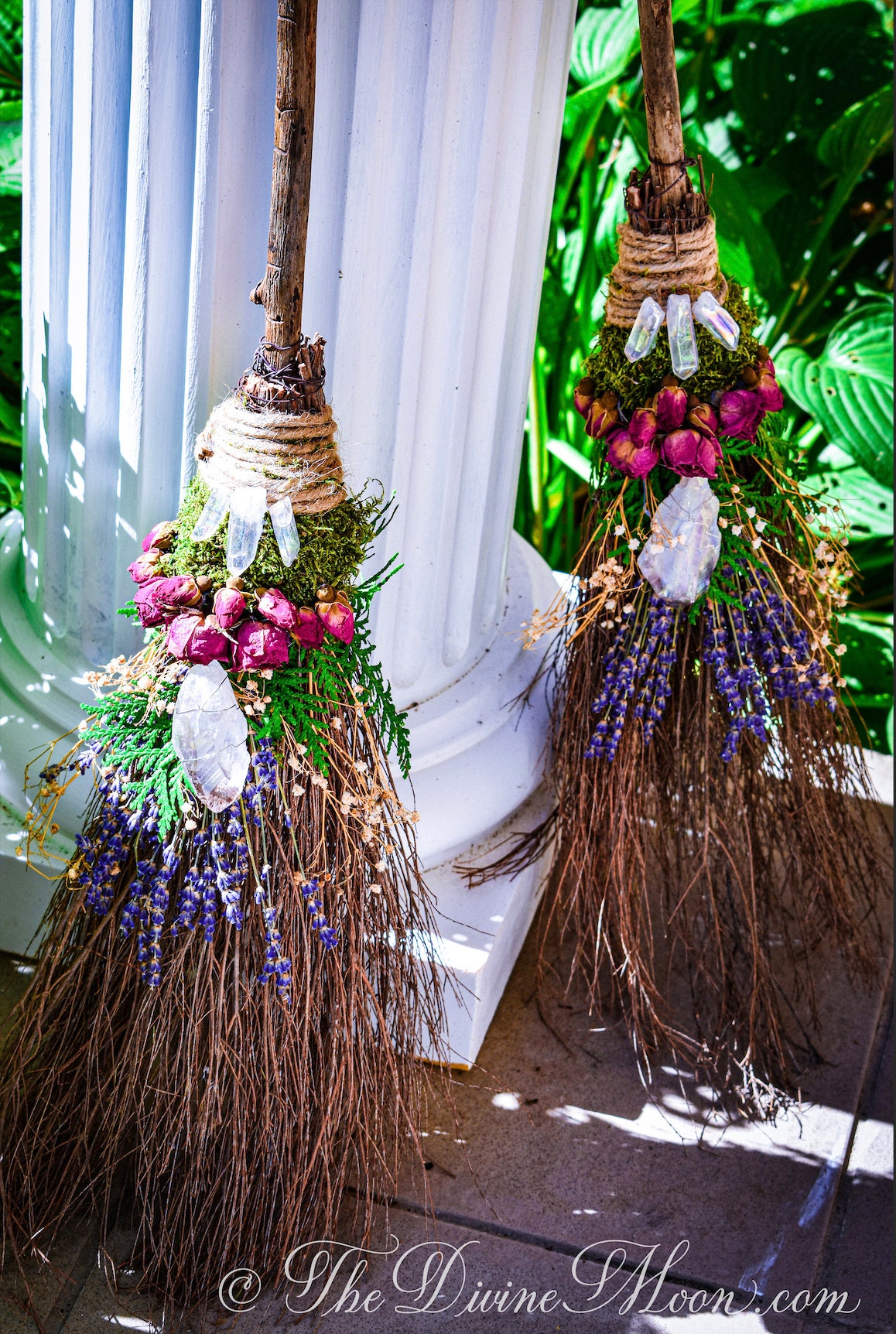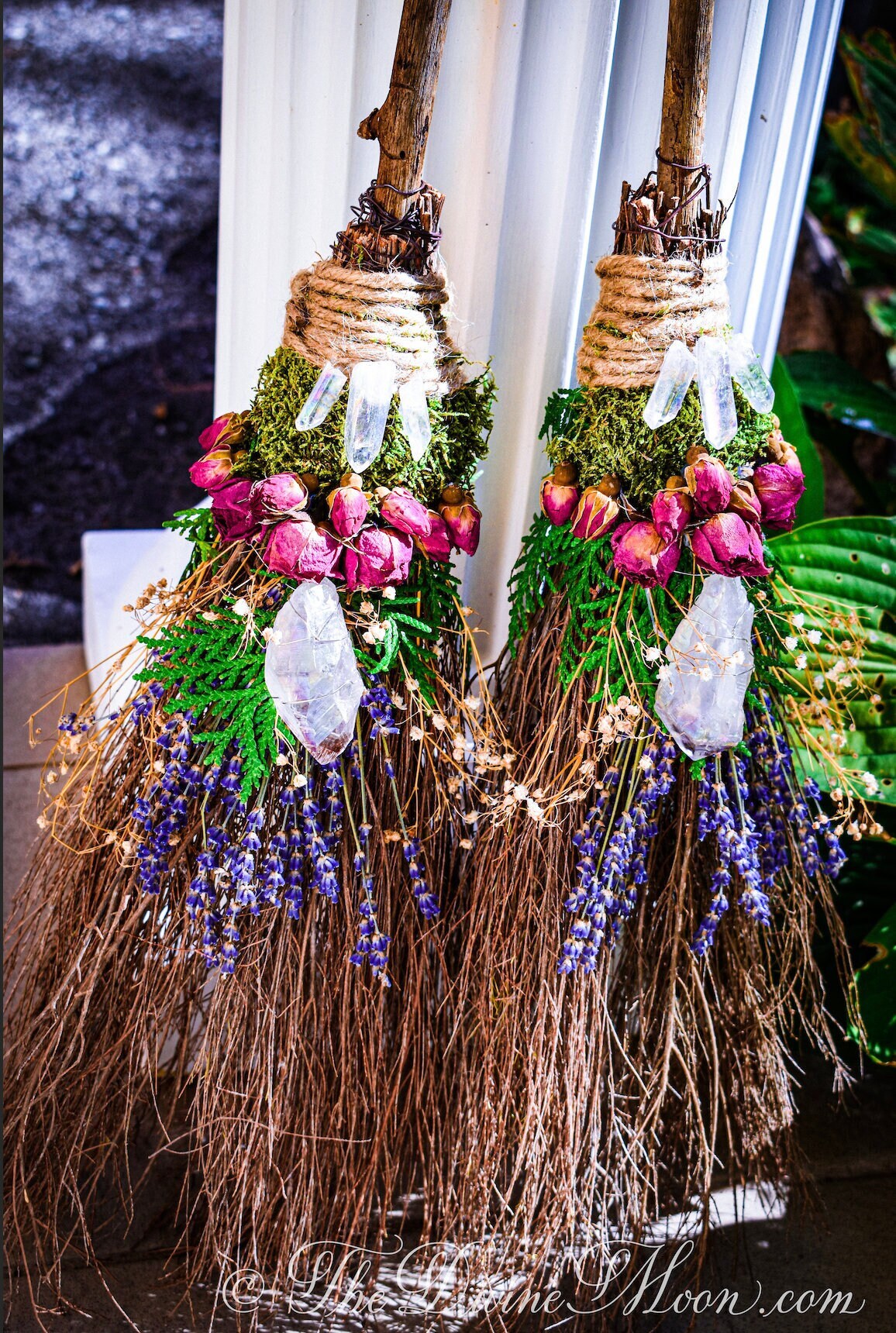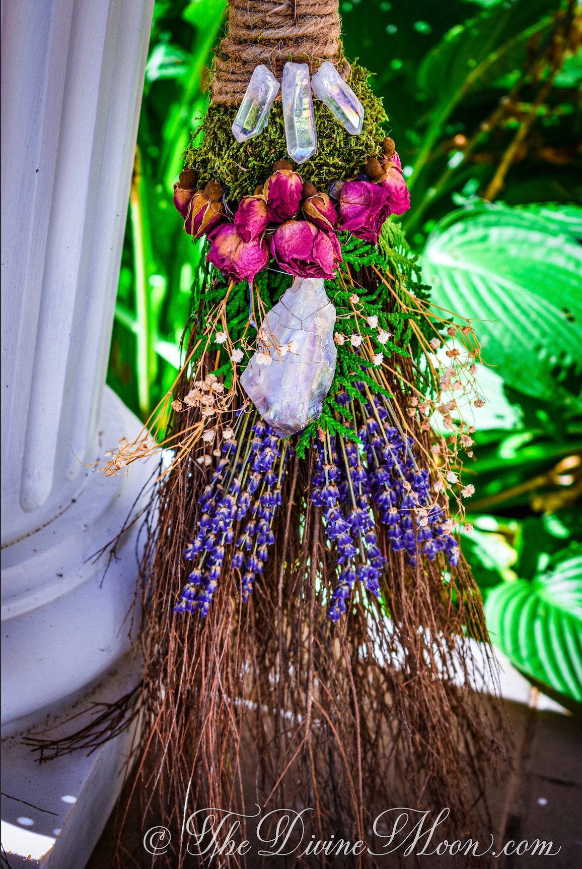 In old folk lore - hanging a cinnamon broom on the back of your door or beside it, symbolizes the sweeping away of obstacles and/or the negative influences of those who enter your home or try to. It helps you multiply earnings and draw in luck and prosperity while warding away negativity. Features one XL Aura Quartz Point and 3 small aura Quartz Points. When opening packaged besom, be careful. it is normal for dried floral to crumble a bit during transit. Delicate and beautiful. Powerful and Ornate. Comes with jute loop attached to hang on wall.
