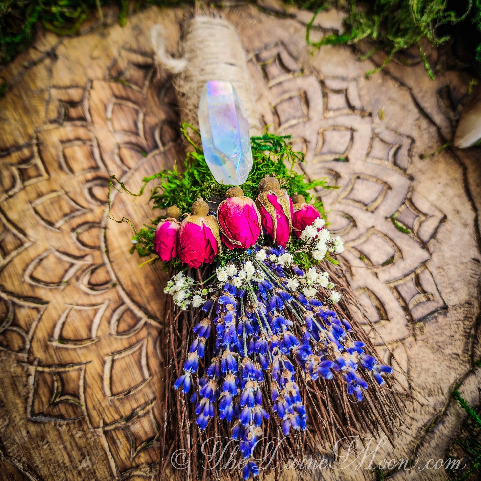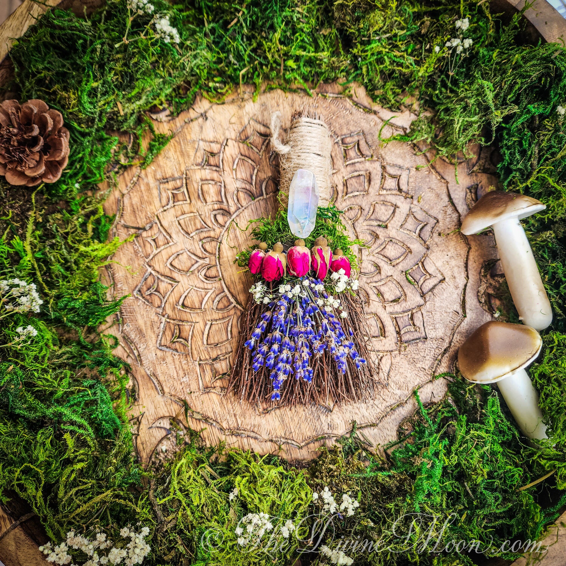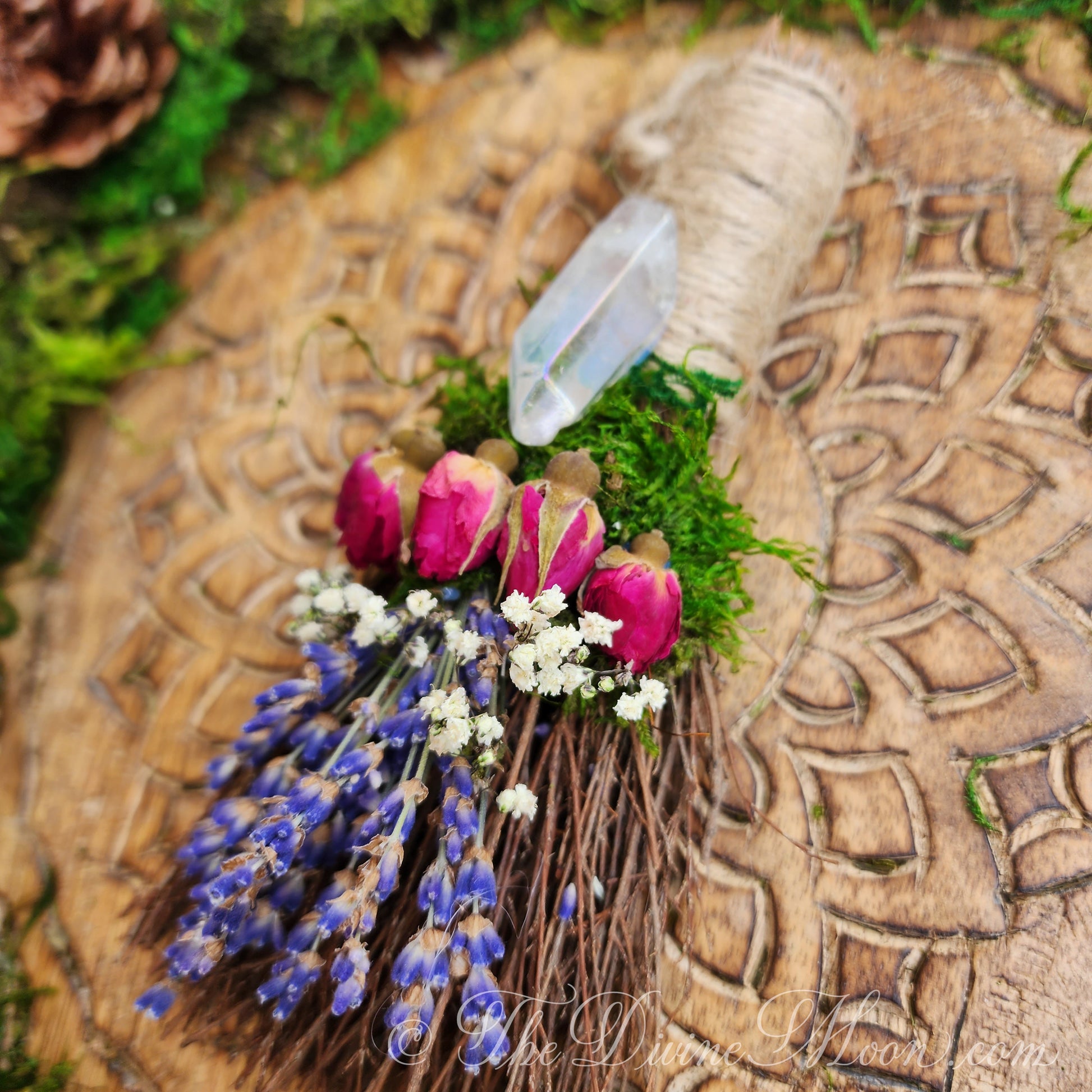 Made of natural sticks, plus dried florals such as roses, lavender, moss, baby breath. Cinnamon Scent. When opening packaged besom, be careful. it is normal for dried floral to crumble a bit during transit. Delicate and beautiful. Comes with jute loop attached to hang on wall. ©TheDivineMoon