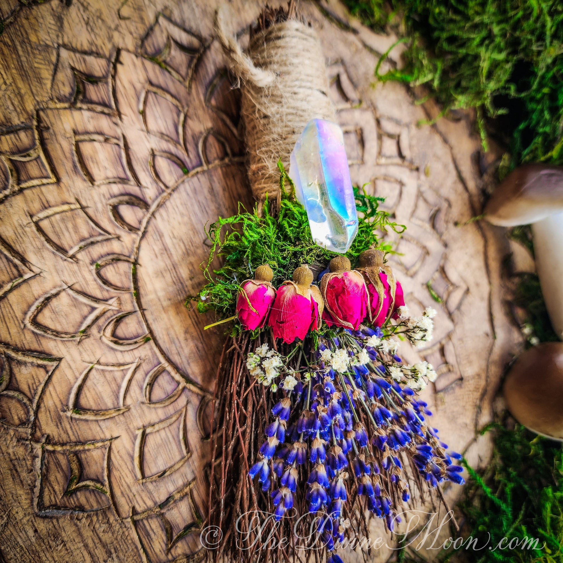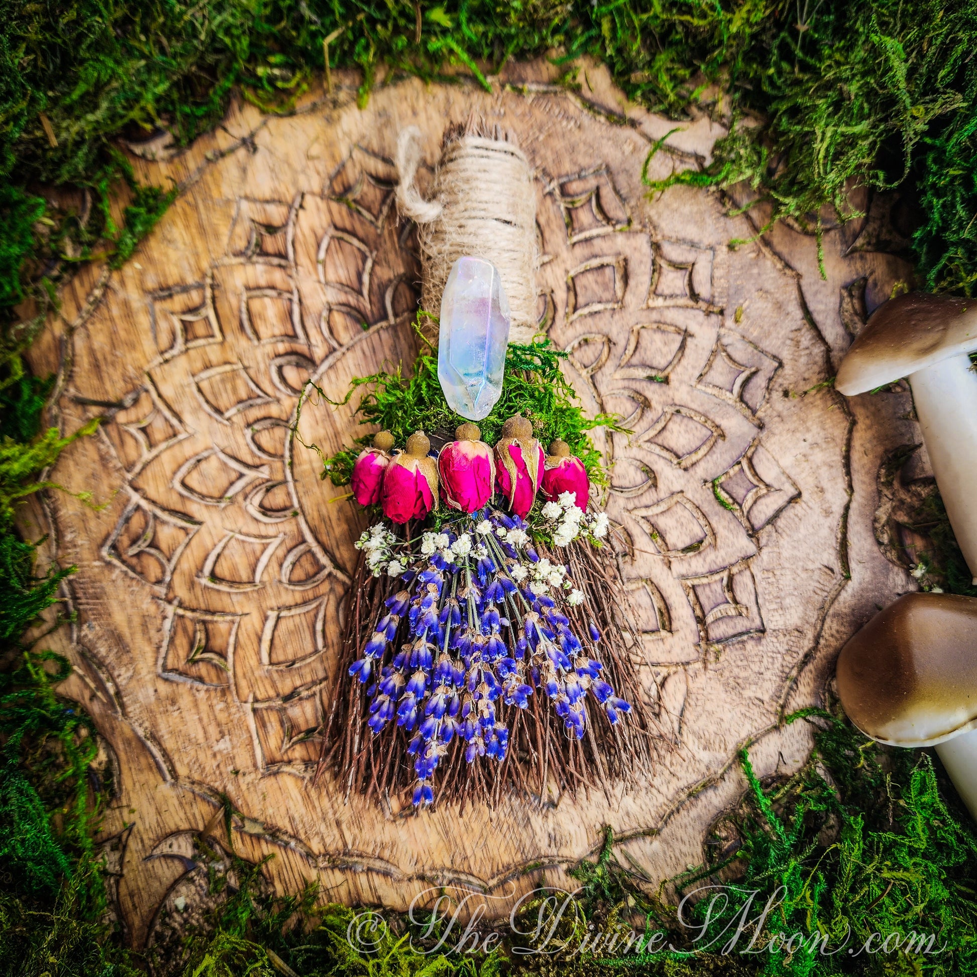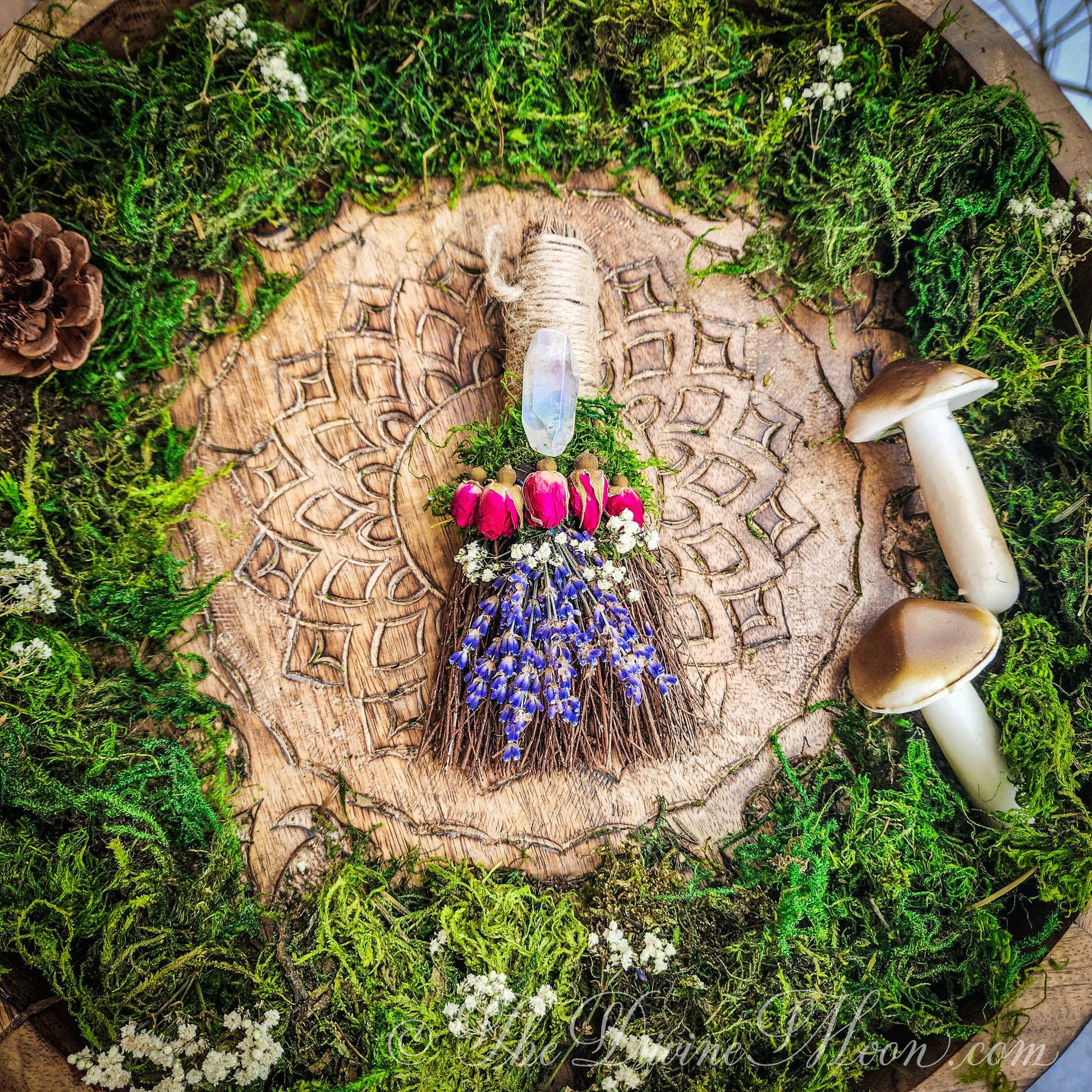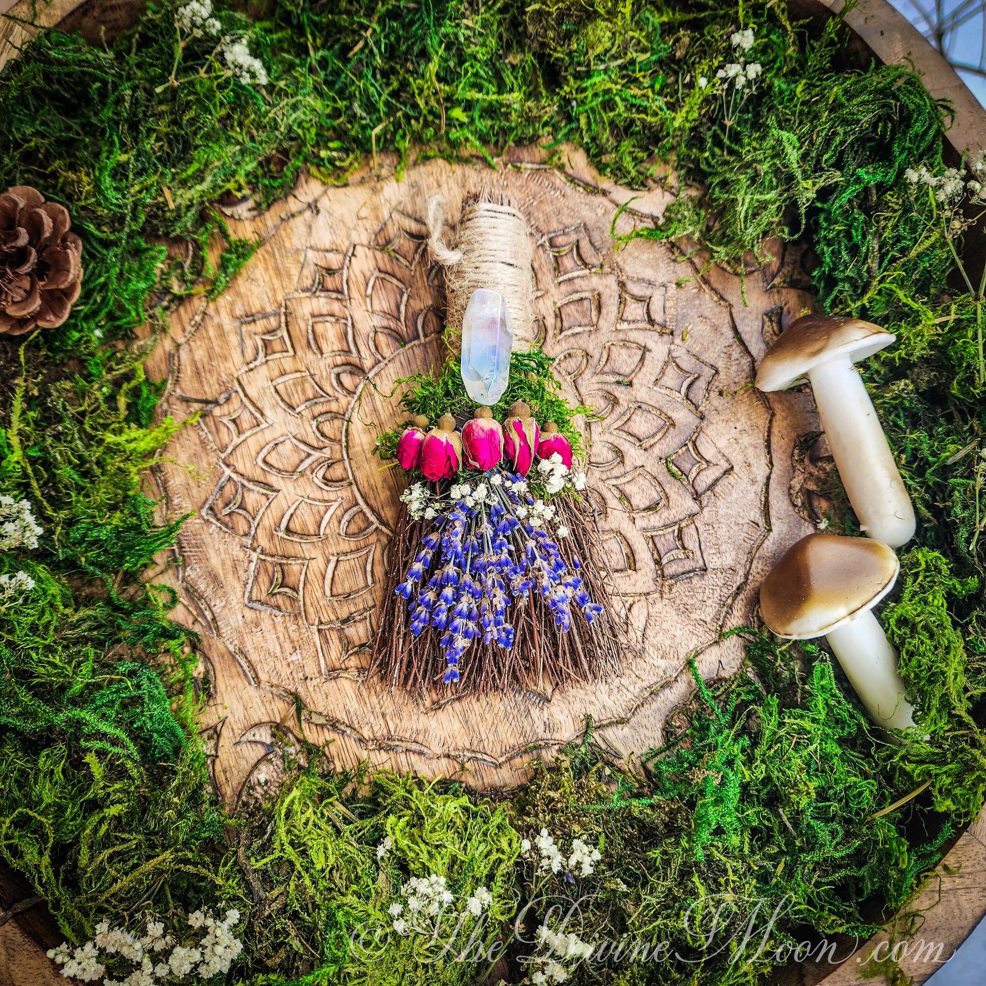 Made of natural sticks, plus dried florals such as roses, lavender, moss, baby breath. Cinnamon Scent. When opening packaged besom, be careful. it is normal for dried floral to crumble a bit during transit. Delicate and beautiful. Comes with jute loop attached to hang on wall. ©TheDivineMoon
