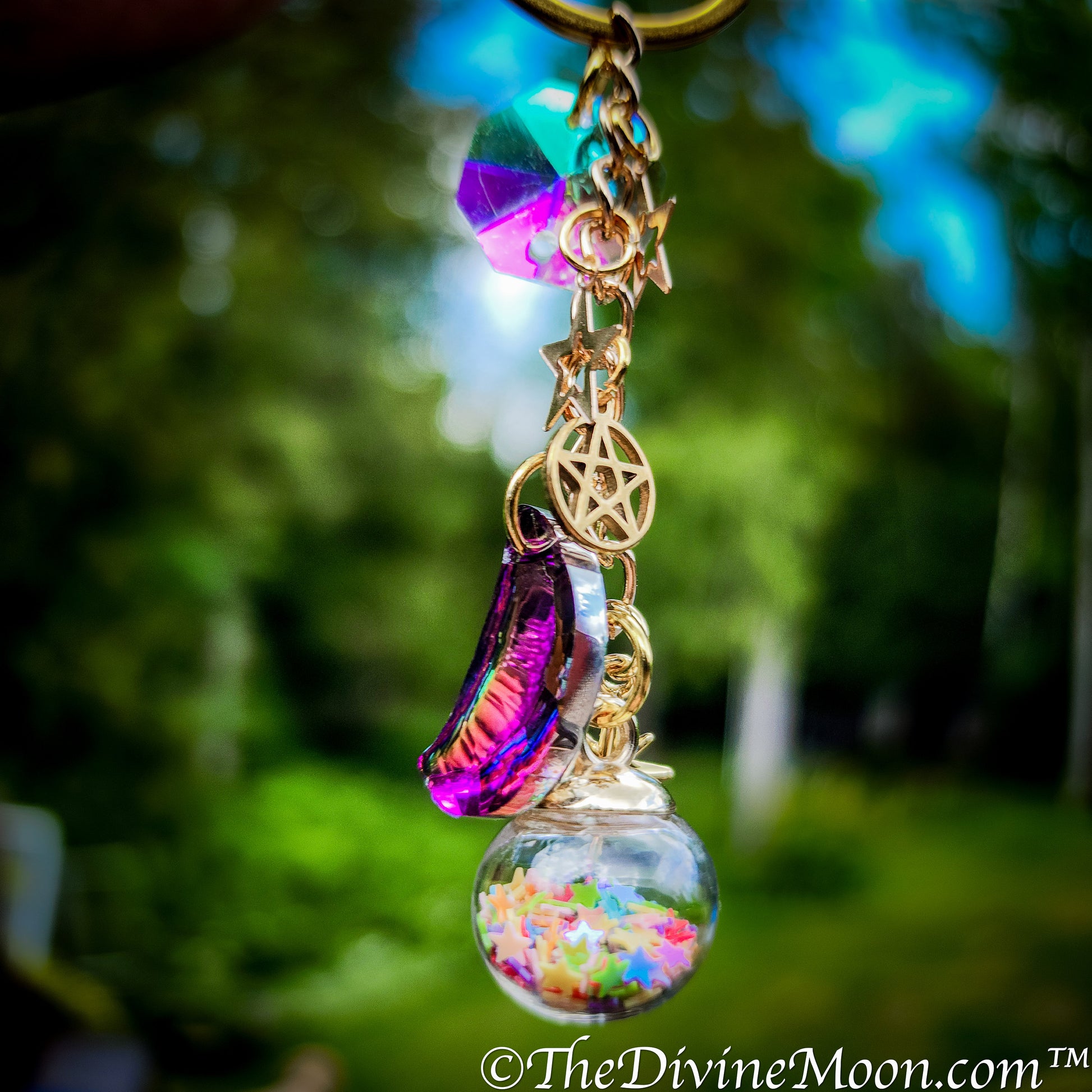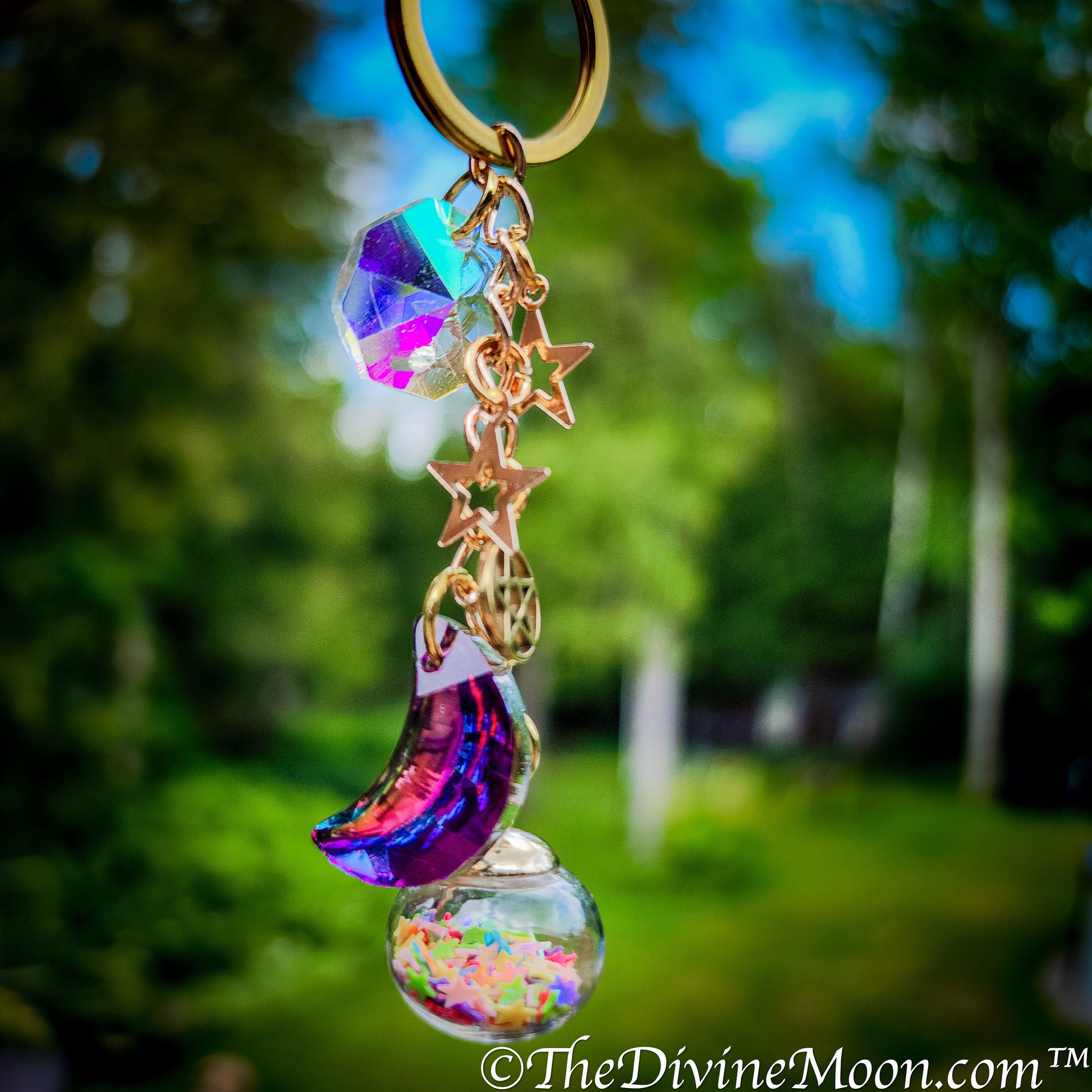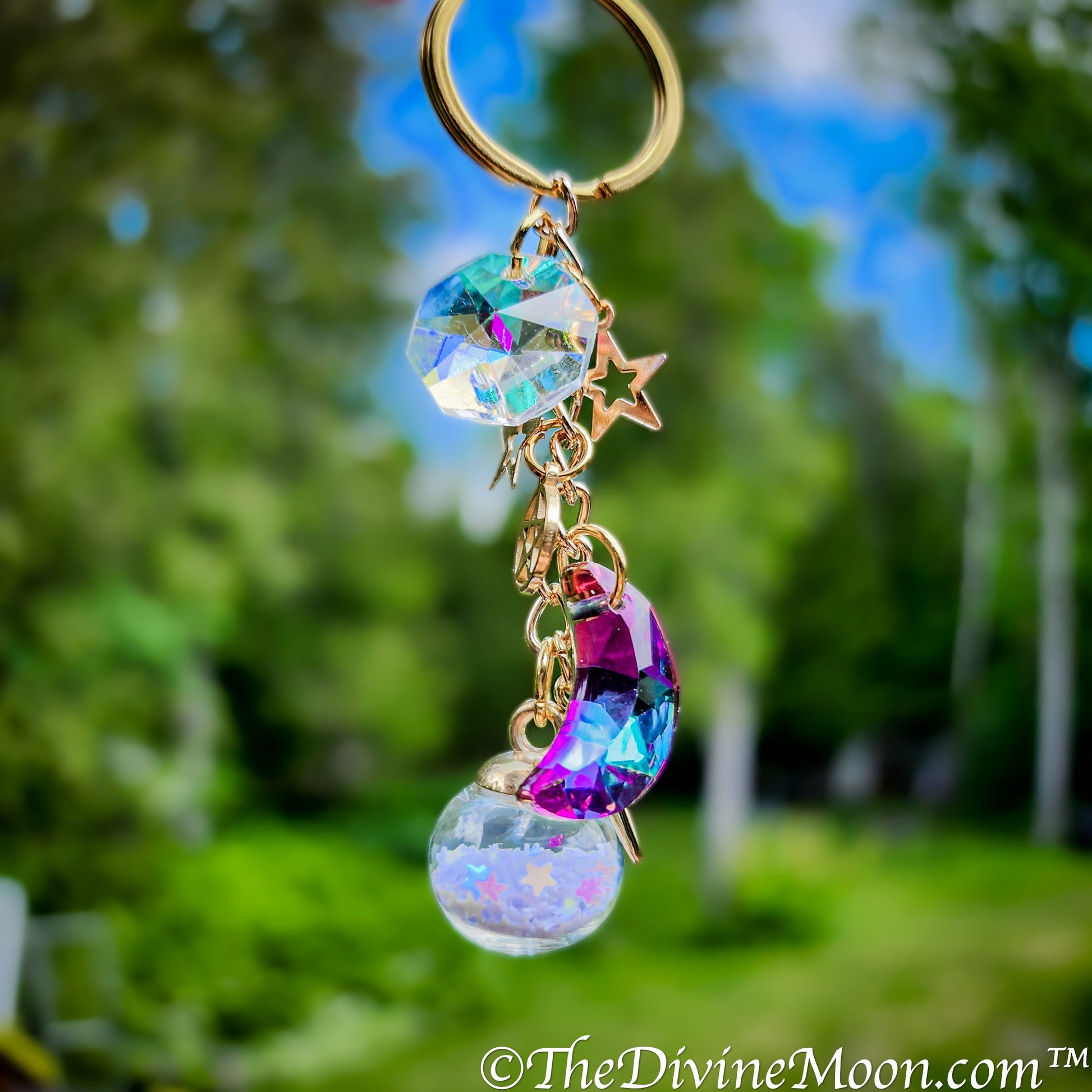 Keychain Features: Handmade Witch Ball (choose: Rainbow or Iridescent) Includes symbolic good luck charms for themes of luck, abundance, and prosperity Accented with a Crystal Aura Moon charm Approx. 4 inches long including keychain hardware Made from lightweight, durable materials
