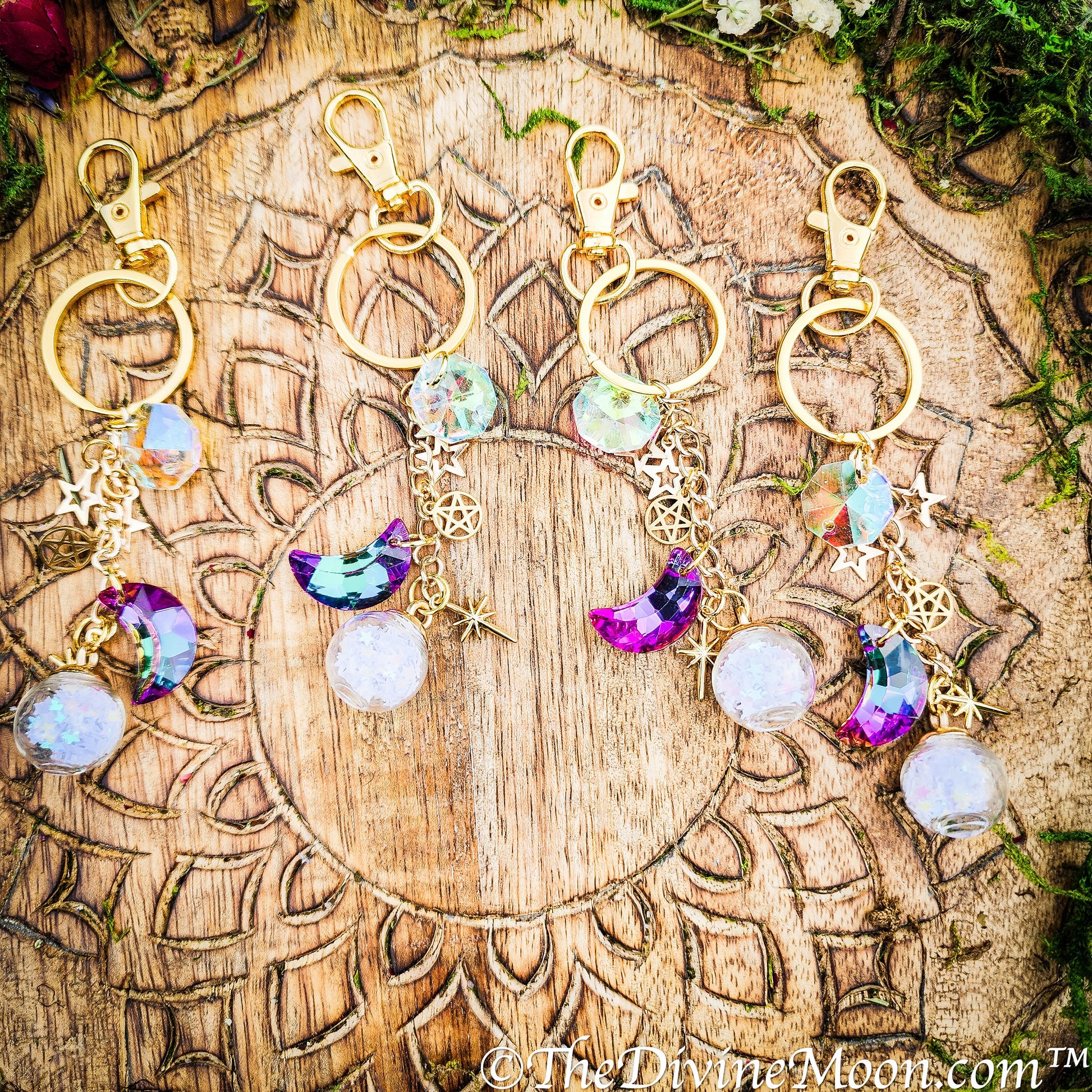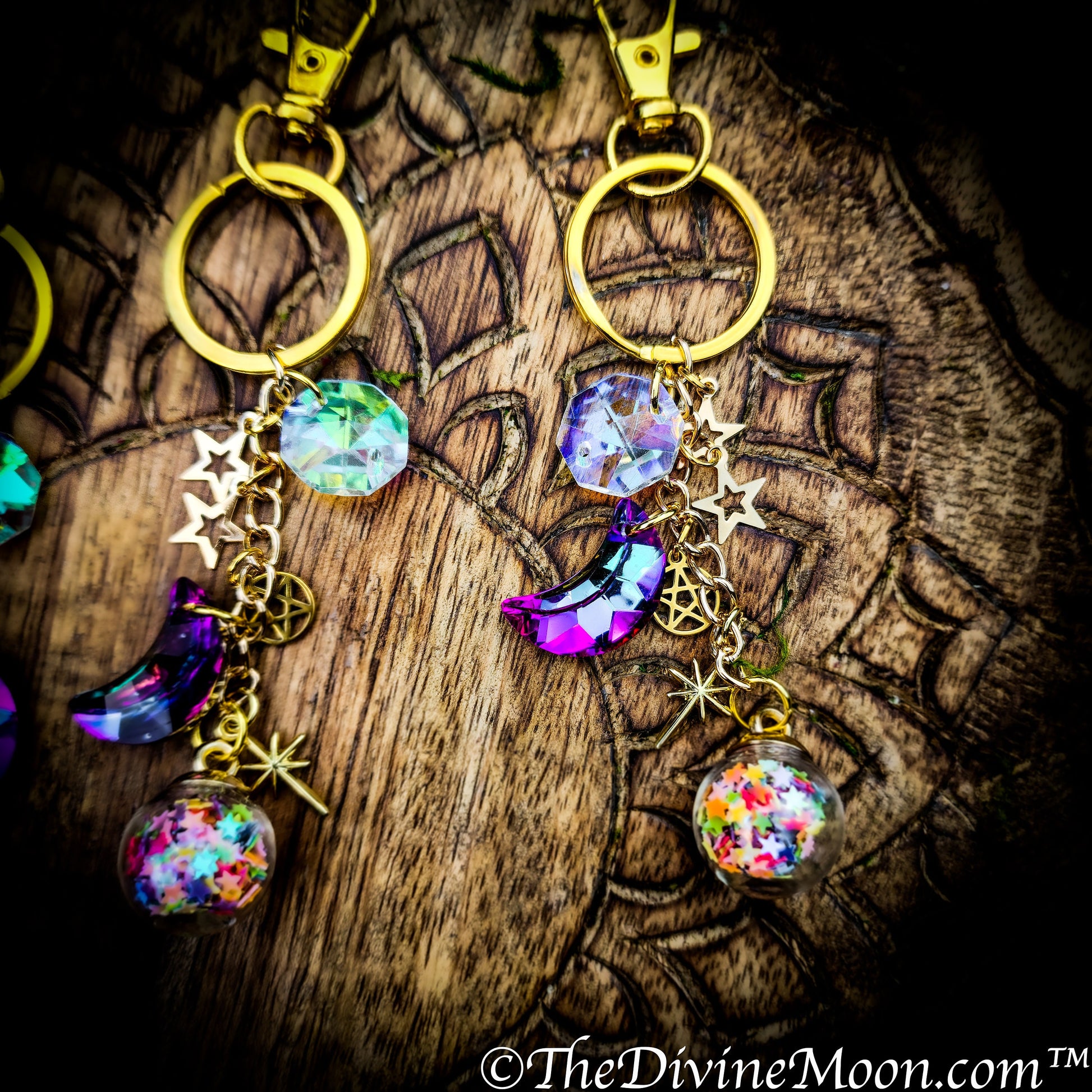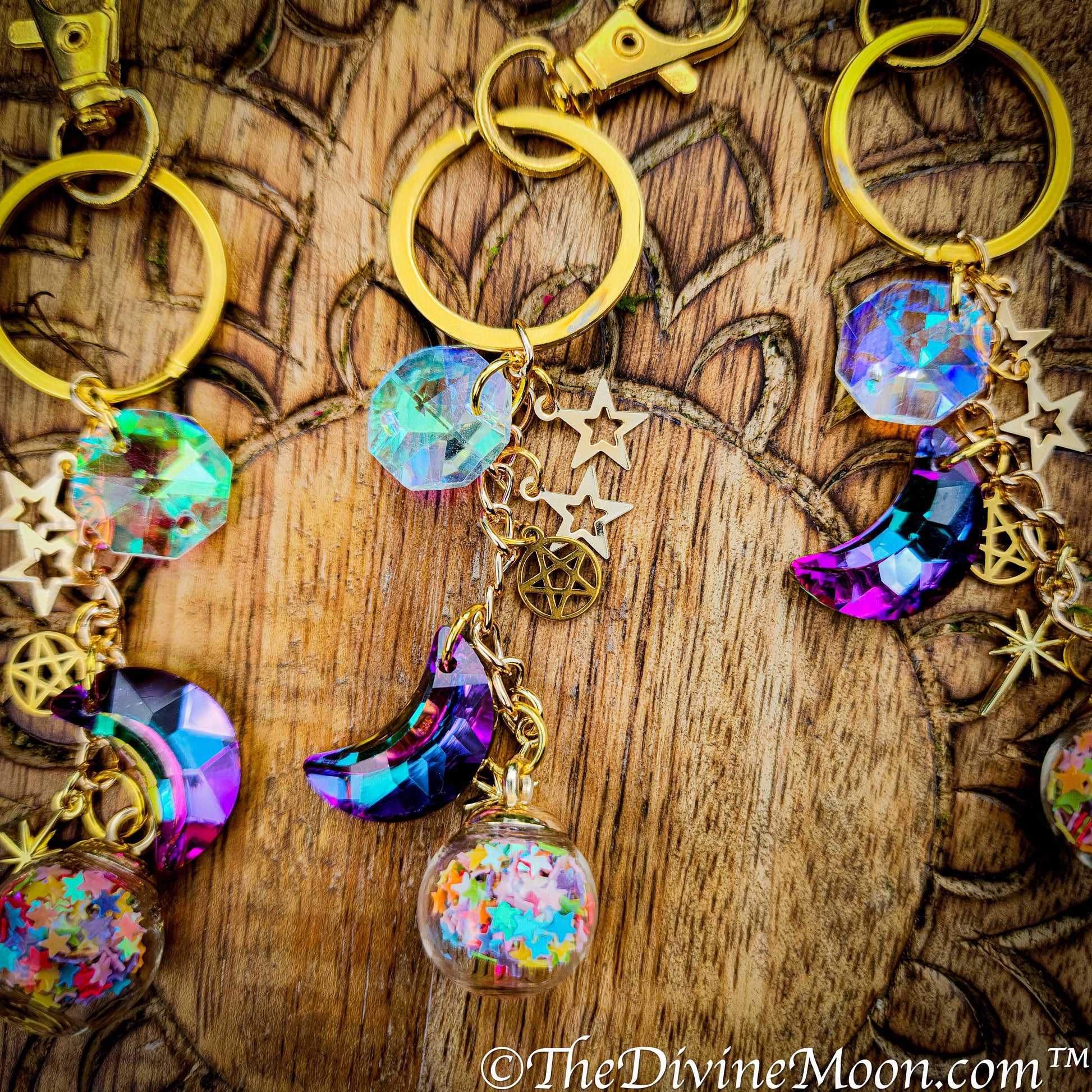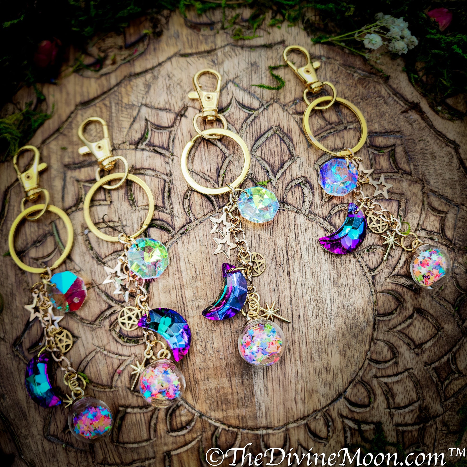 Keychain Features: Handmade Witch Ball (choose: Rainbow or Iridescent) Includes symbolic good luck charms for themes of luck, abundance, and prosperity Accented with a Crystal Aura Moon charm Approx. 4 inches long including keychain hardware Made from lightweight, durable materials