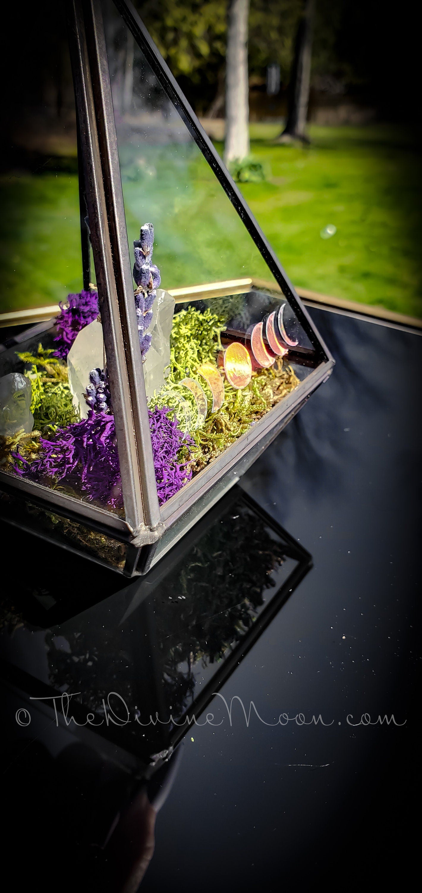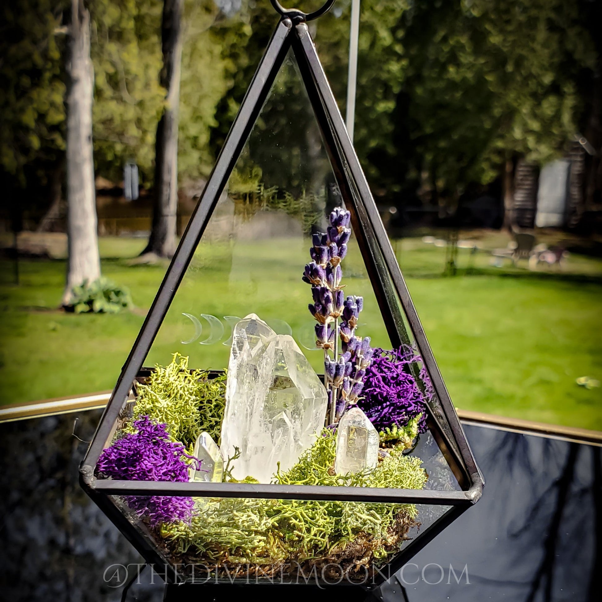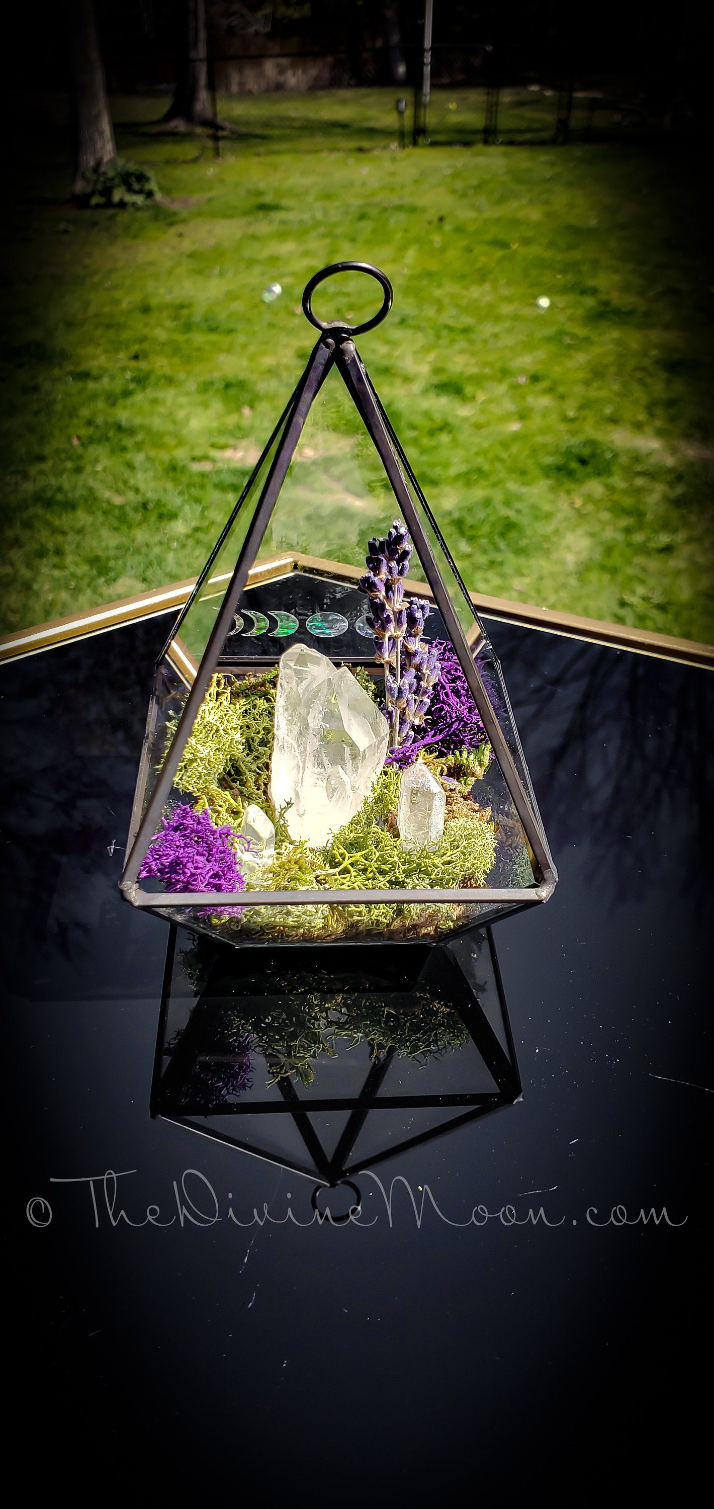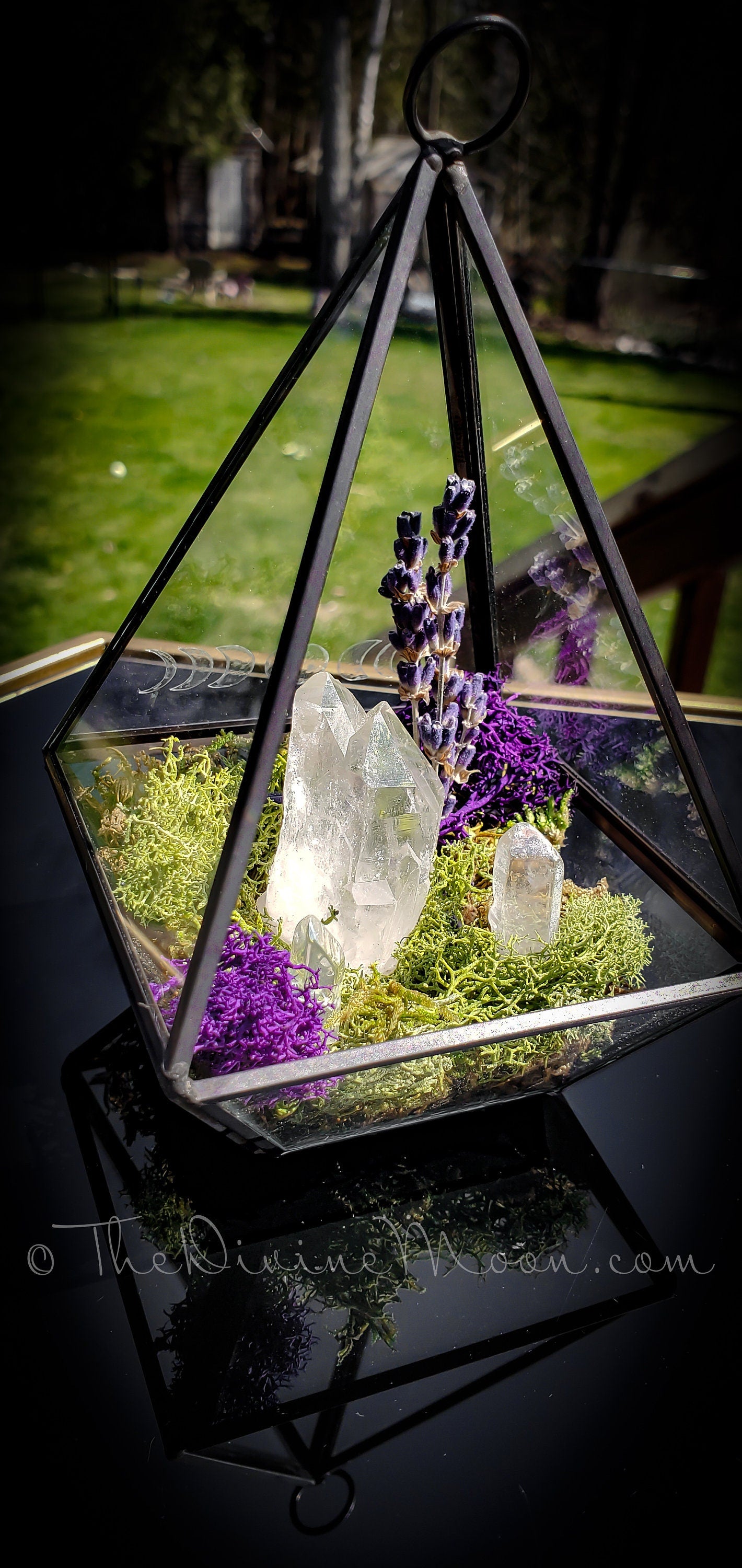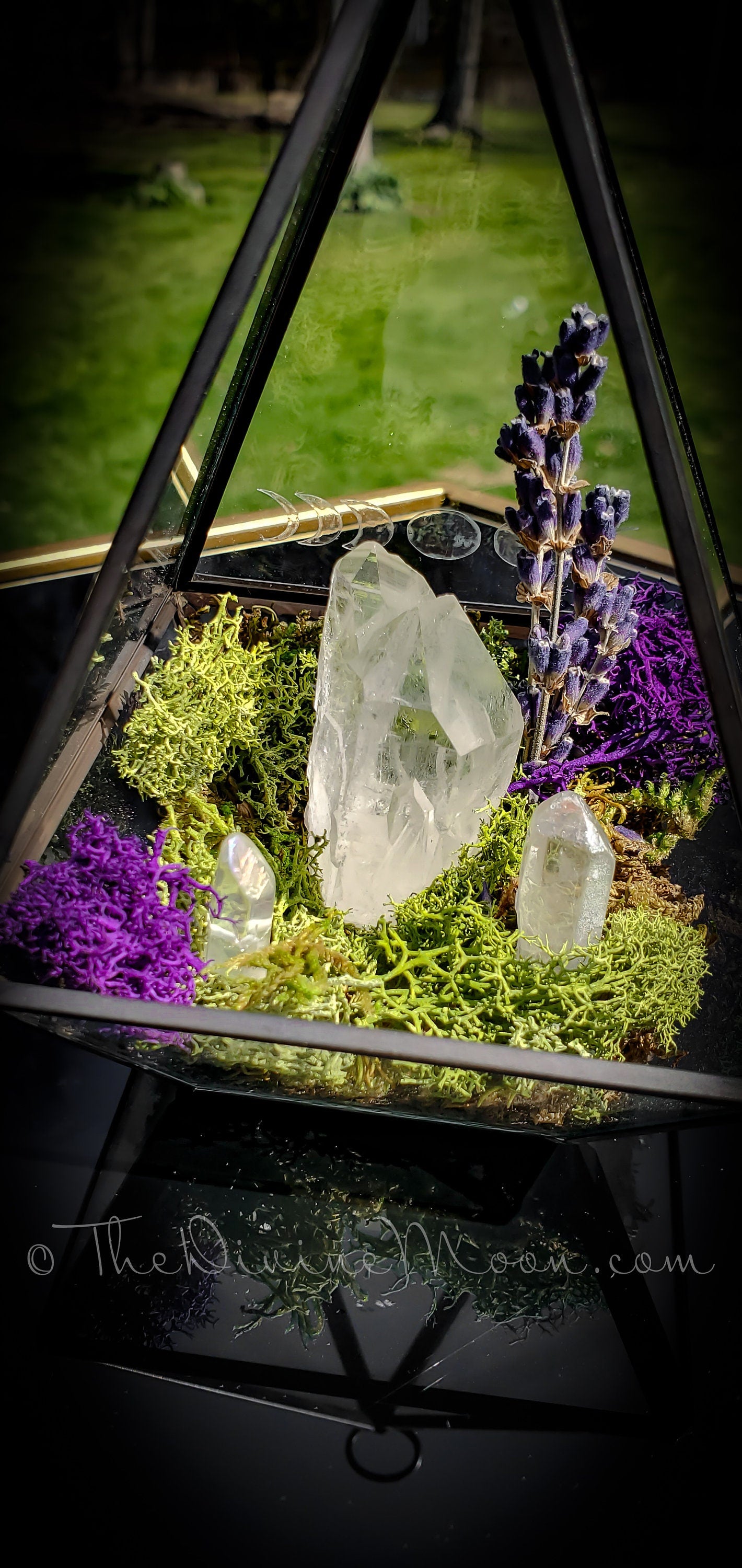 Includes: One (1) large free-standing quartz point Multiple aura quartz crystals Green and purple moss Dried lavender Glass and metal diamond terrarium (approx. 6-9” high)