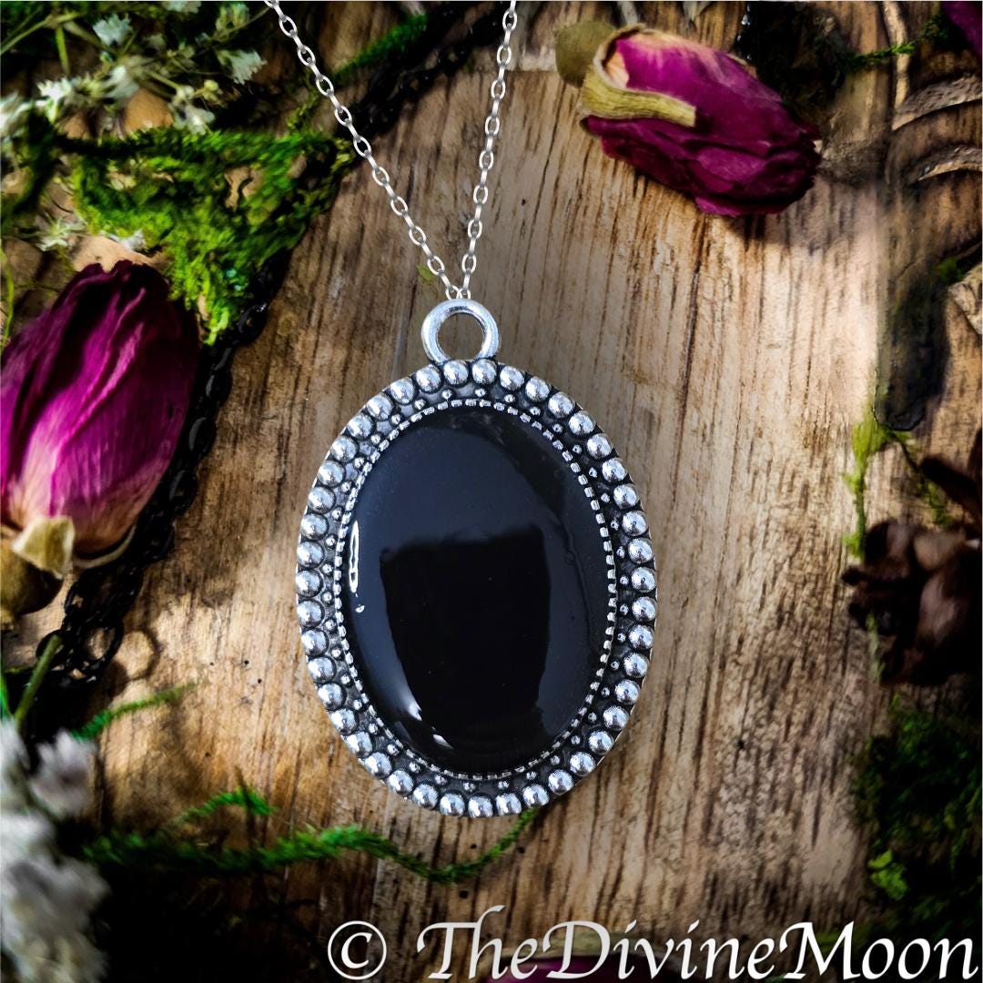Size: 1 inch, plus 16 inch silver necklace Authentic Scrying Necklaces handmade for on the go readings. Antique Ornate Gothic Round Black Mirror Victorian French Antique Vintage Scrying Black Mirror with genuine vintage necklace frame for witchcraft and wicca divination. Refinished necklaces with handmade insert for black scrying mirror. Beautiful piece and one of a kind. Includes "How to scry in a black mirror" letter.