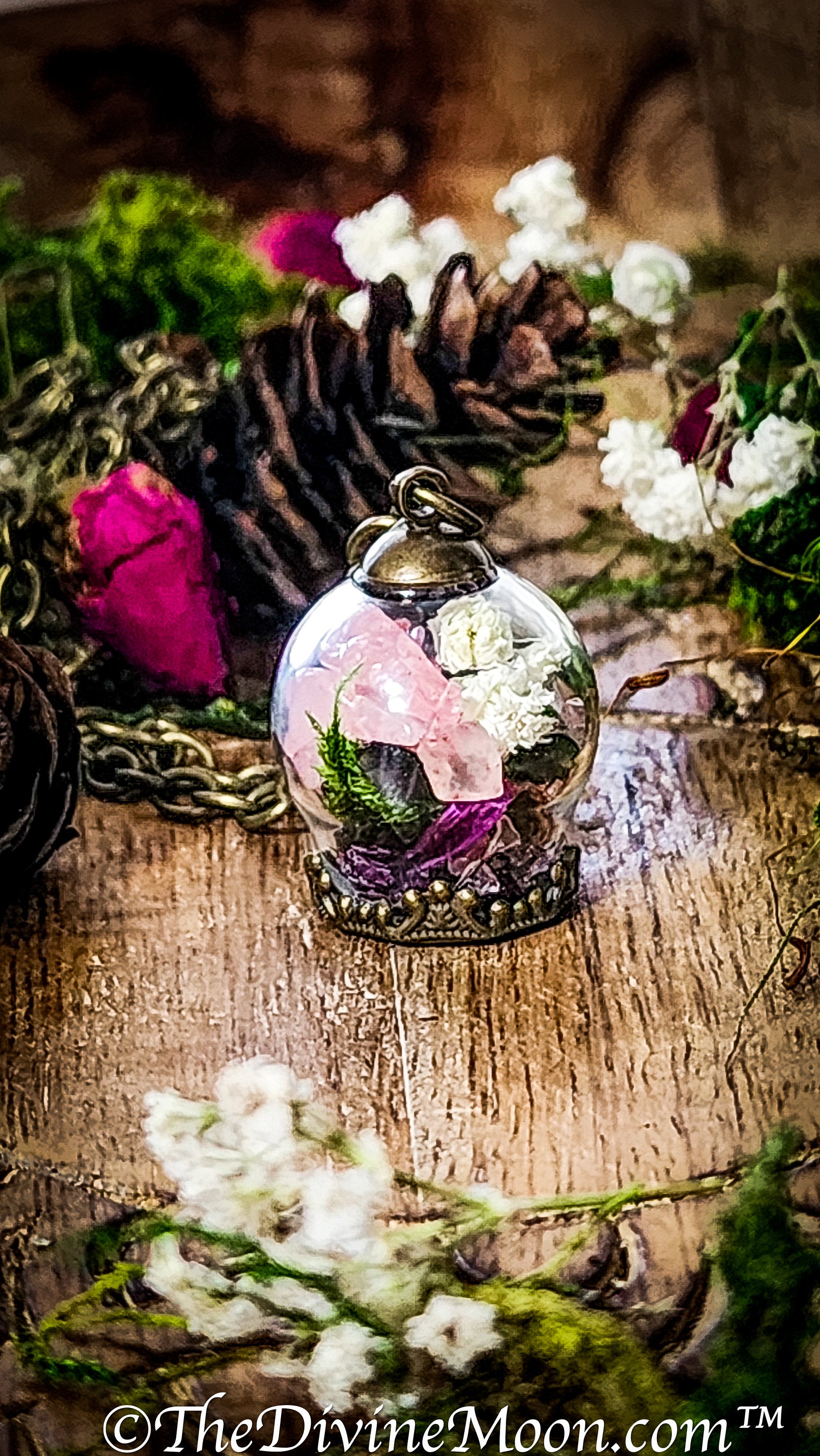 This unique pendant is a beautiful reminder of personal strength and heart-centered energy. Each glass orb is carefully assembled and charged under the full moon, blending natural elements with symbolic meaning to create a striking accessory for everyday wear. Inside Your Pendant: Rose Quartz Chips Obsidian Stones Baby’s Breath Mugwort Dried Moon Flowers Moss …and a dash of symbolic magick