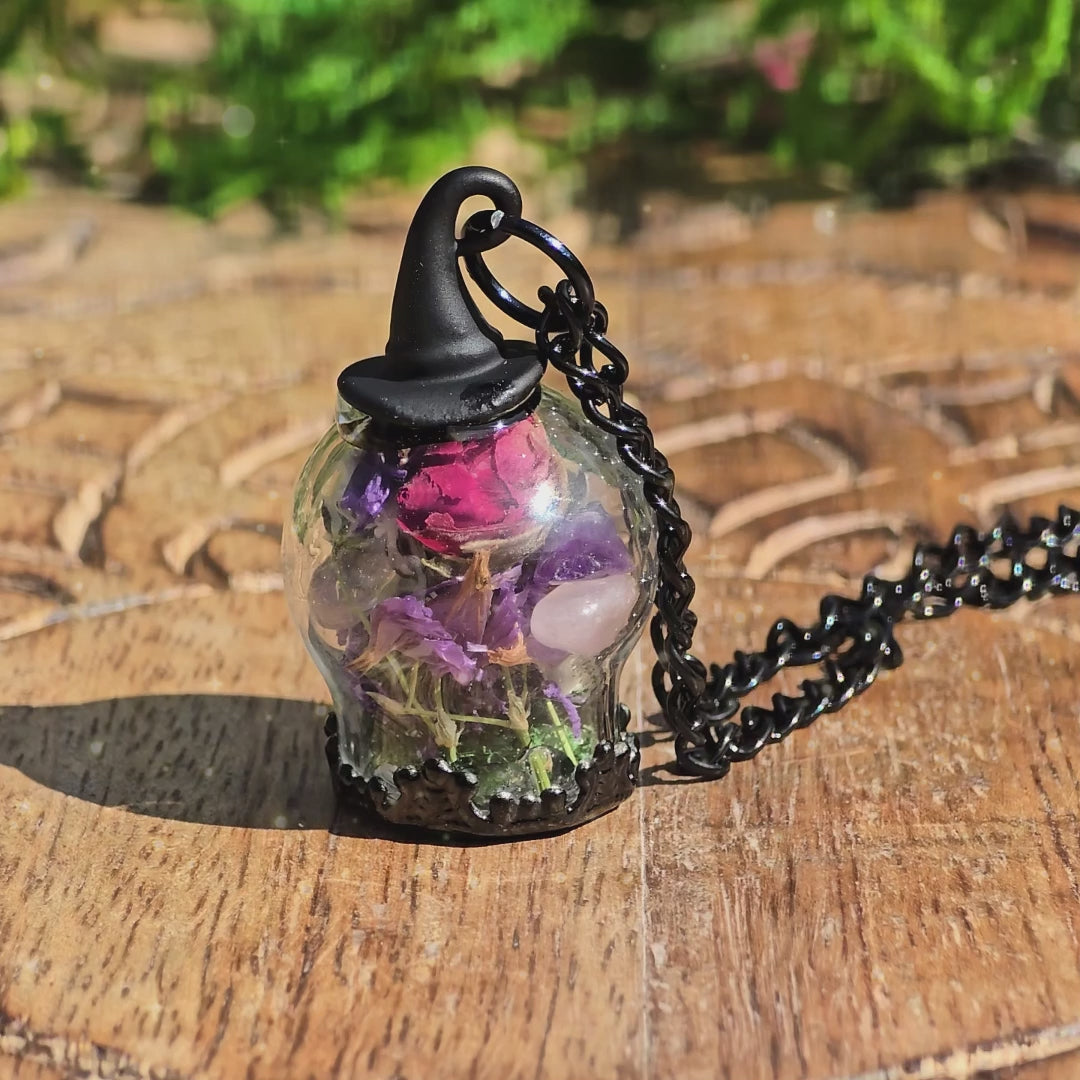 Carry a touch of magic wherever you go with this witch ball necklace. Encased in a tiny glass globe topped with a whimsical witch hat, it holds dried flowers and crystals to bring beauty, charm, and a hint of enchantment to your everyday style. Perfect for witchy souls, boho lovers, or anyone who adores unique handmade jewelry.