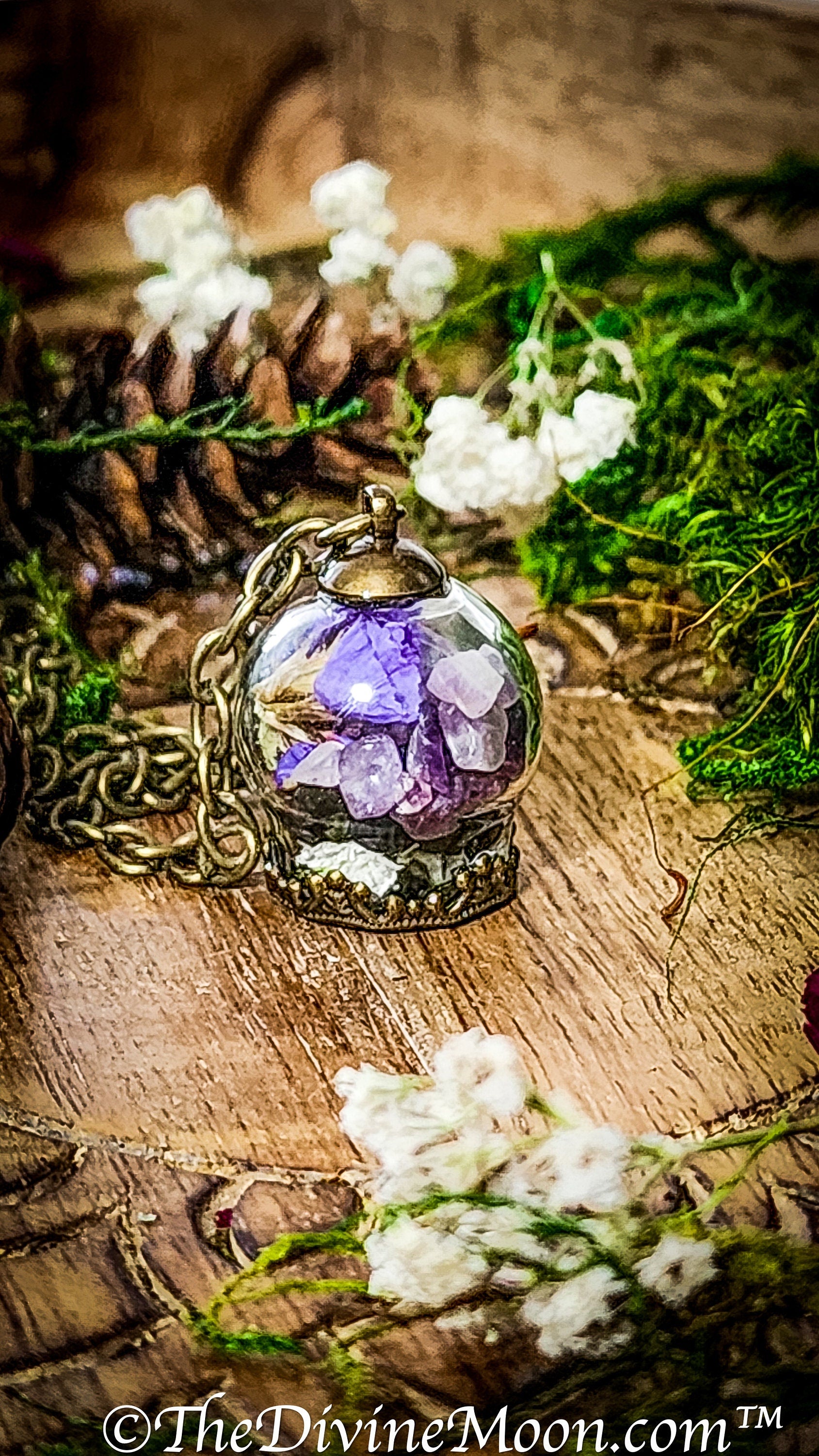 Pendant: Amethyst Chips Obsidian Stones Dried Forget-Me-Nots Baby’s Breath Flowers Sage Moss …and a dash of symbolic magick Each pendant is hand-assembled and charged under the full moon, crafted with care and intuitive design. Comes with an informational card explaining the symbolism behind its contents.